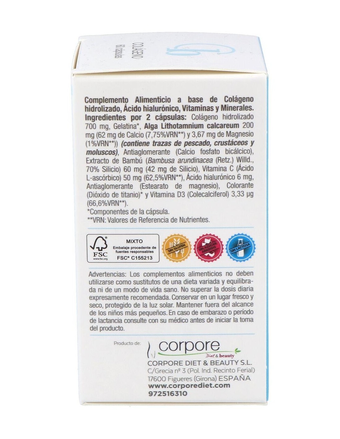 COLÁGENO HIDROLIZADO. ÁCIDO HIALURÓNICO. ALGA LITHOTAMNIUM CALCAREUM CON 31% DE CALCIO Y 1,85% DE MAGNESIO. EXTRACTO DE BAMBÚ (70% SILICIO). VITAMINA C (ÁCIDO L-ASCÓRBICO). VITAMINA D3 (COLECALCIFEROL). EXCIPIENTES: CALCIO FOSFATO BICÁLCICO. MAGNESIO ESTEARATO (ANTIAGLOMERANTES). GELATINA (CÁPSULA).