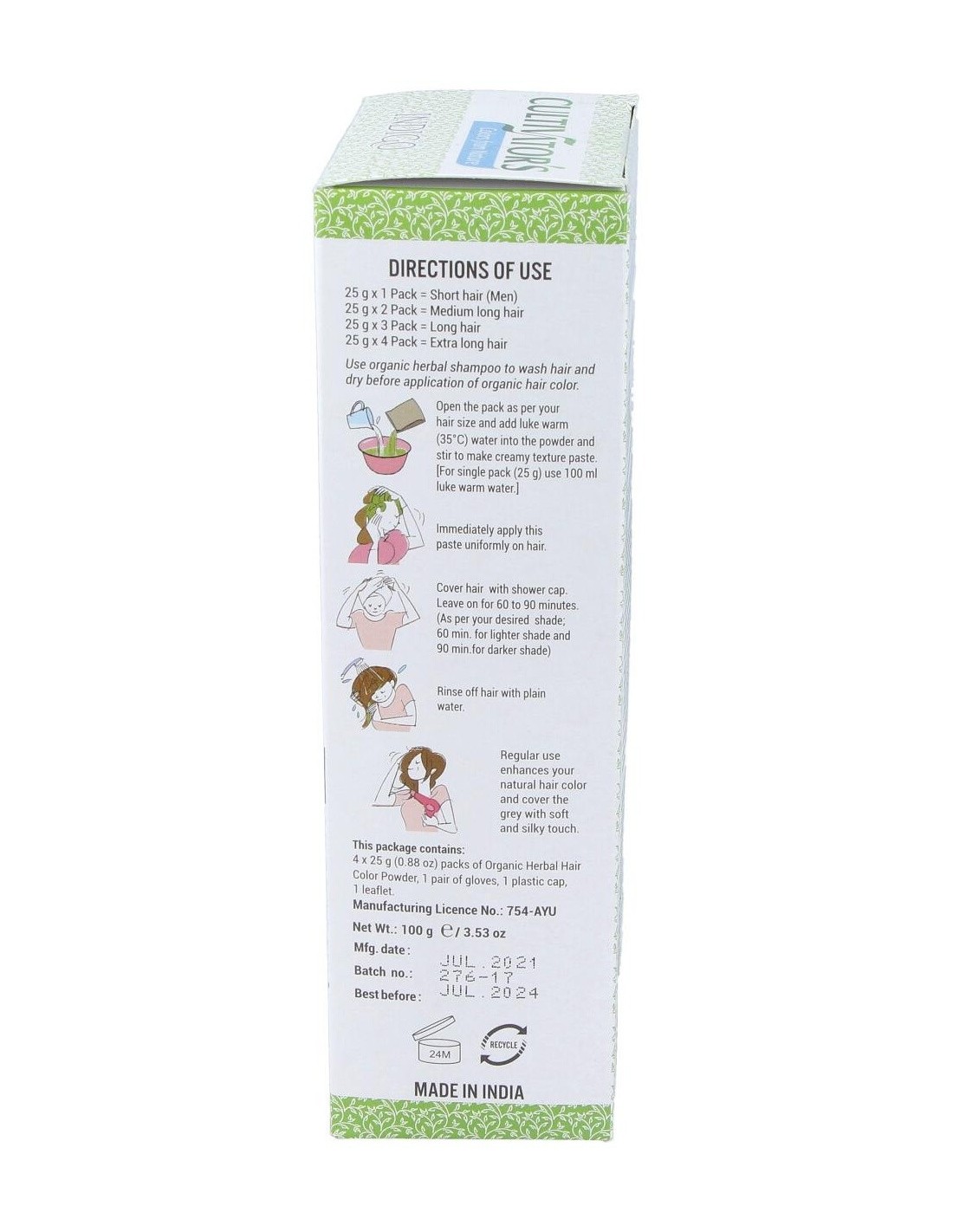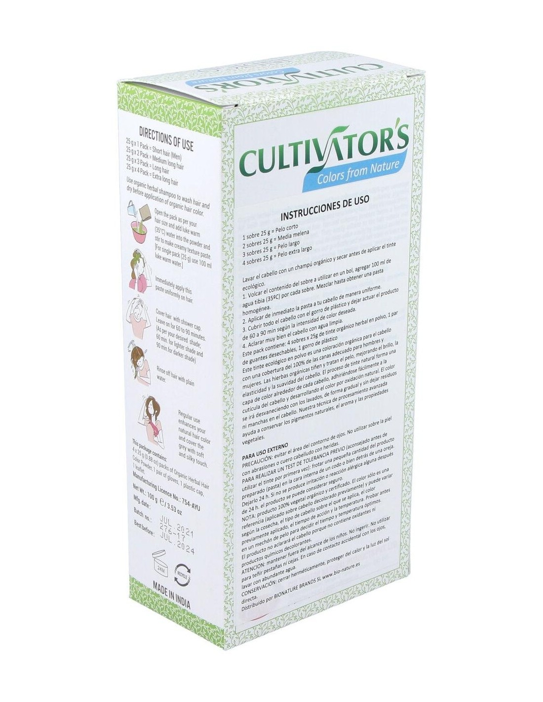 Lavar el cabello con un champú orgánico y secar antes de aplicar el tinte ecológico. Abrir el sobre o los sobres a utilizar según largo del pelo y volcar el contenido en un bol, agregar 100 ml de agua tibia (35ºC) por cada sobre. Mezclar hasta obtener una pasta homogénea. Aplicar de inmediato la pasta a tu cabello de manera uniforme. Cubrir todo el cabello con el gorro de plástico y dejar actuar el producto de 60 a 90 min según intensidad de color deseada (60 min para obtener un tono más claro y 90 min para la máxima intensidad de cada color). Aclarar muy bien el cabello con agua limpia.