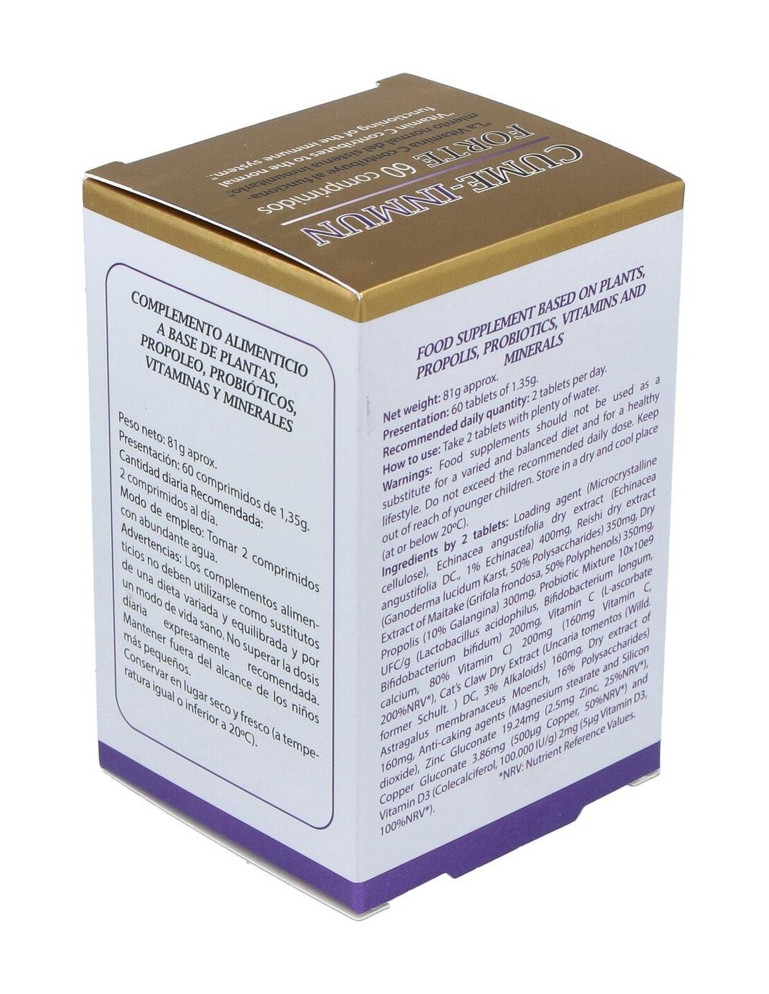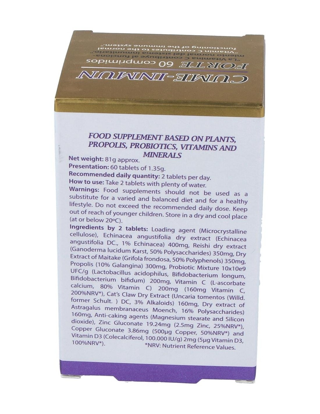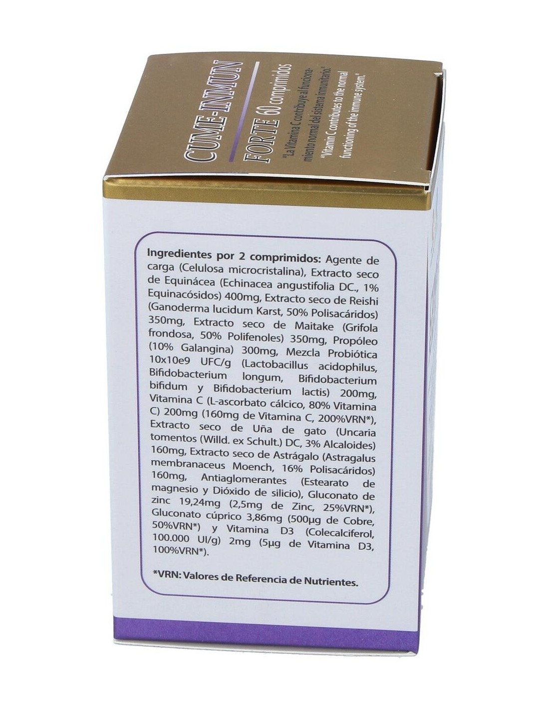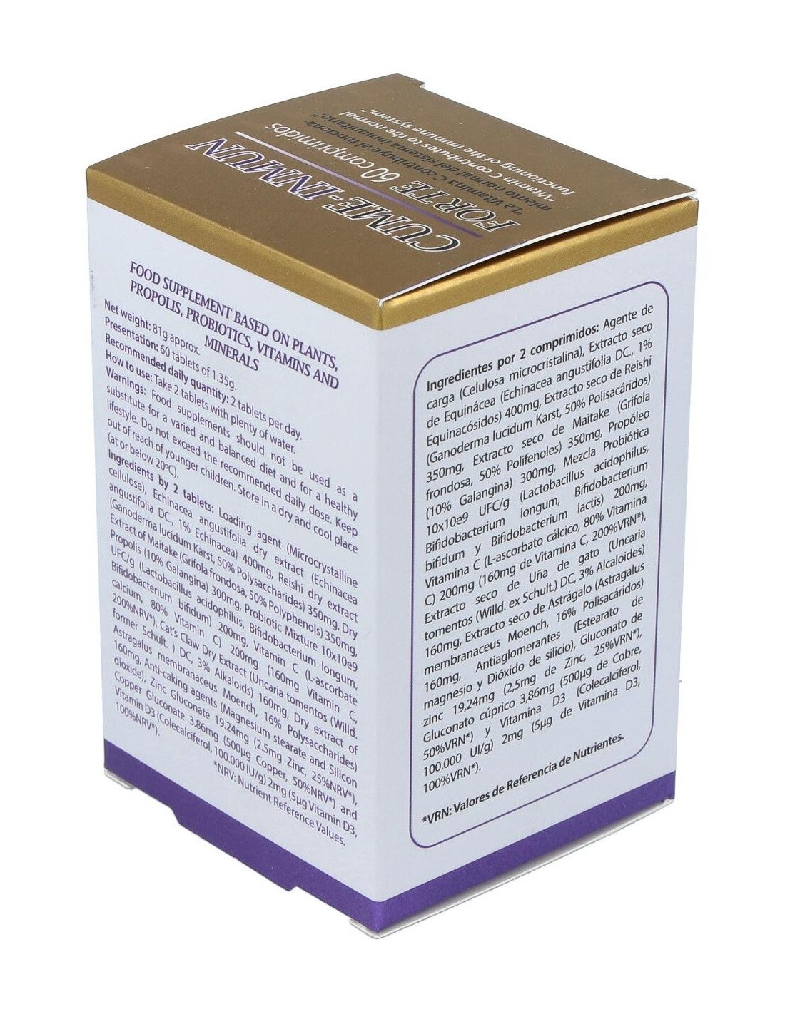 Celulosa microcristalina, equinácea (echinacea angustifolia) 400 mg, reishi (ganoderma lucidum karst) 350 mg, maitake (grifolia frondosa) 350 mg, propóleo 300 mg, mezcla probiótica 10x10e9 UFC/g (lactobacillus acidophillus, bifidobacterium longum, bifidobacterium bifidum y bifidobacterium lactis) 200 mg, vitamina C (L-ascorbato cálcico 80% vitamina C) 200 mg (160 mg vitamina C), uña de gato (uncaria tormentos) 160 mg, astrágalo (astragalus membranaceus moench) 160 mg, estearato de magnesio, dióxido de silicio, gluconato de zinc 19,24 mg (2,5 mg de zinc), gluconato cúprico 3,86 mg (500 mcg de cobre), vitamina D3 (colecalciferol 100. 000 UI/g) 2 mg (5 mcg de vitamina D3)