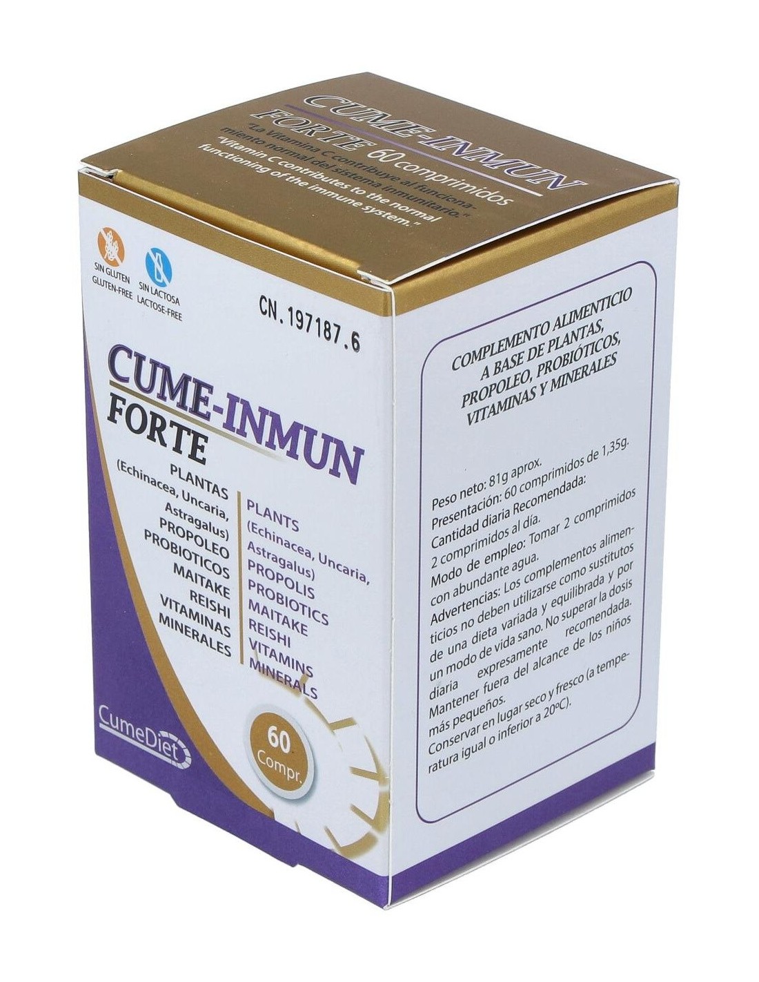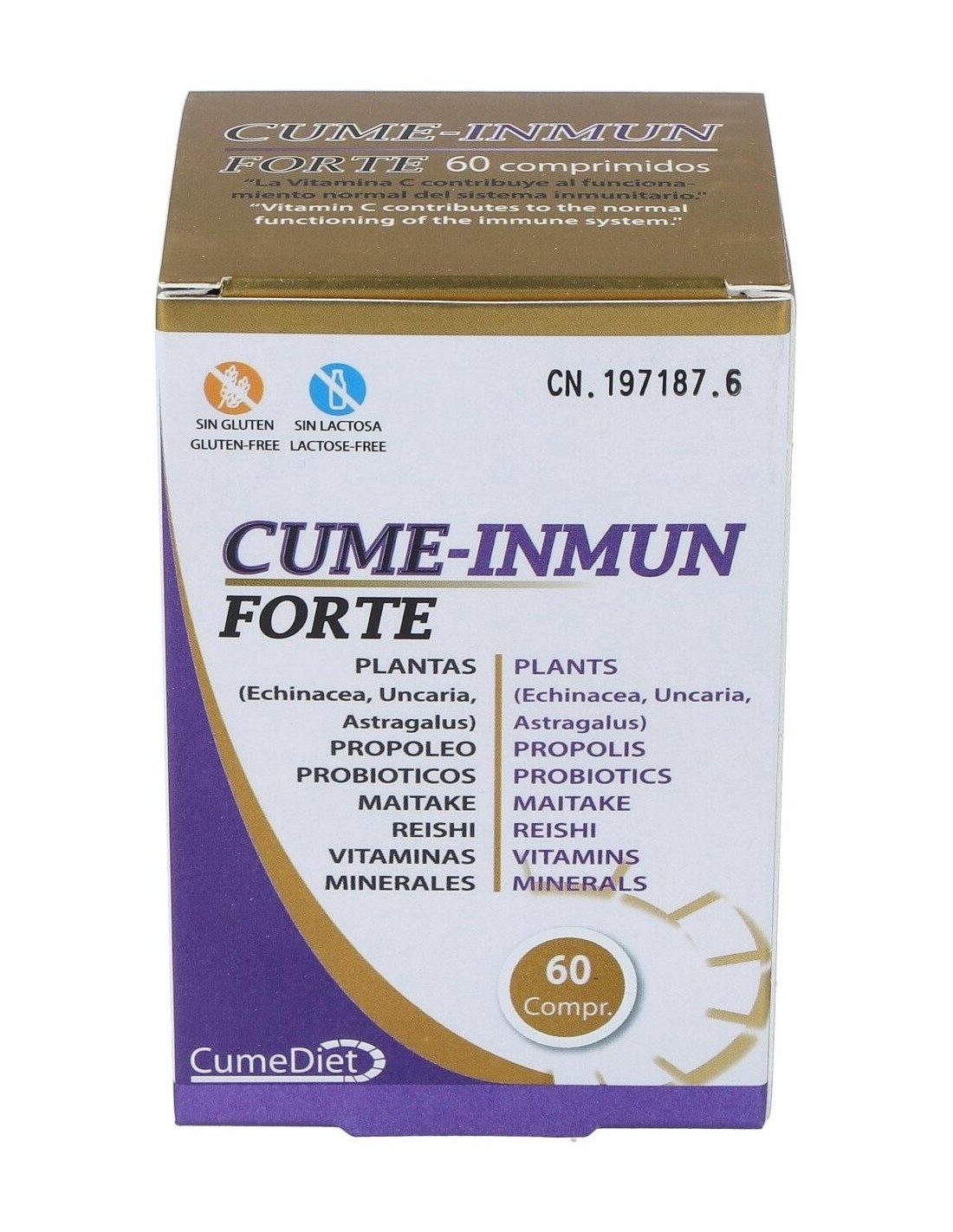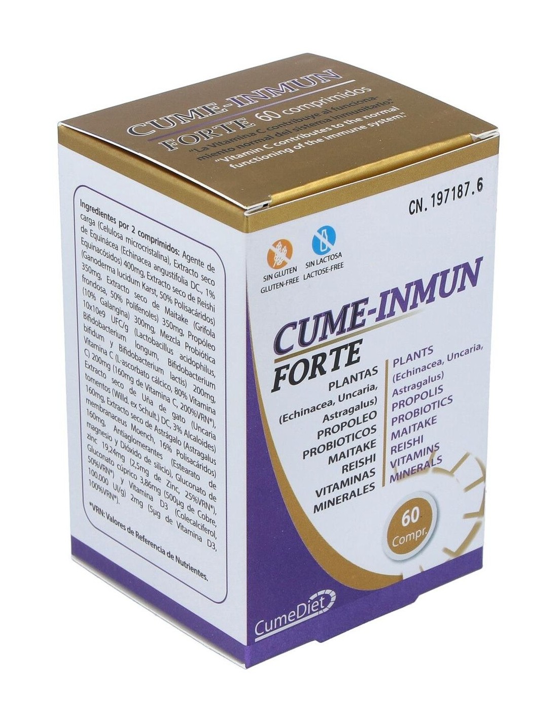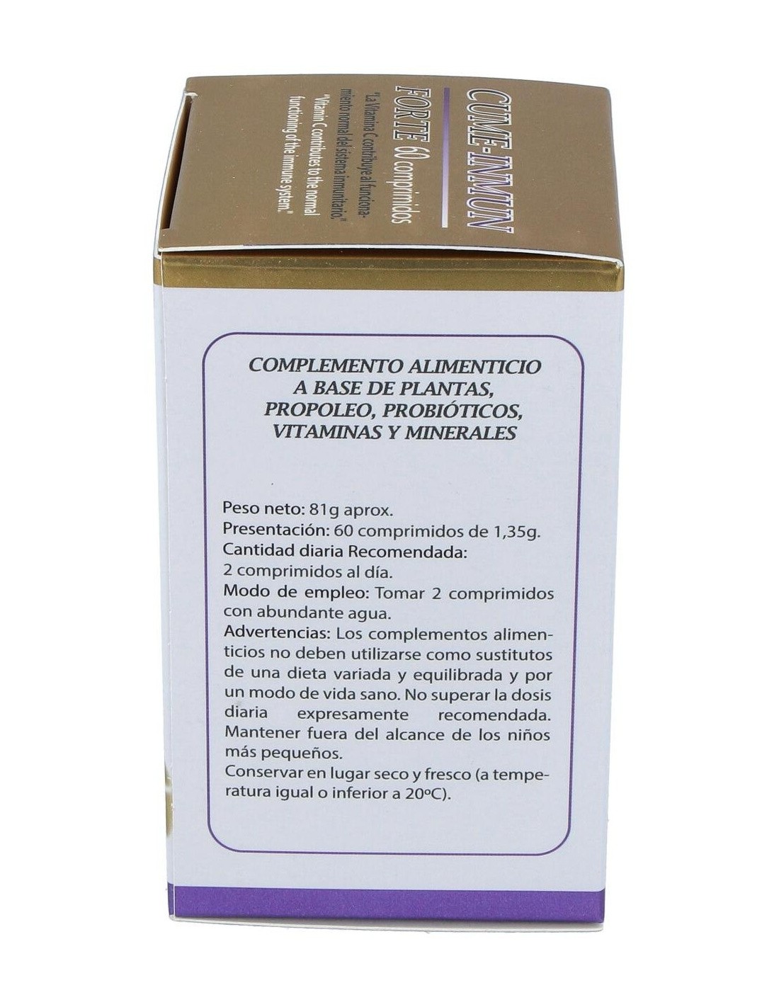 Celulosa microcristalina, equinácea (echinacea angustifolia) 400 mg, reishi (ganoderma lucidum karst) 350 mg, maitake (grifolia frondosa) 350 mg, propóleo 300 mg, mezcla probiótica 10x10e9 UFC/g (lactobacillus acidophillus, bifidobacterium longum, bifidobacterium bifidum y bifidobacterium lactis) 200 mg, vitamina C (L-ascorbato cálcico 80% vitamina C) 200 mg (160 mg vitamina C), uña de gato (uncaria tormentos) 160 mg, astrágalo (astragalus membranaceus moench) 160 mg, estearato de magnesio, dióxido de silicio, gluconato de zinc 19,24 mg (2,5 mg de zinc), gluconato cúprico 3,86 mg (500 mcg de cobre), vitamina D3 (colecalciferol 100. 000 UI/g) 2 mg (5 mcg de vitamina D3)