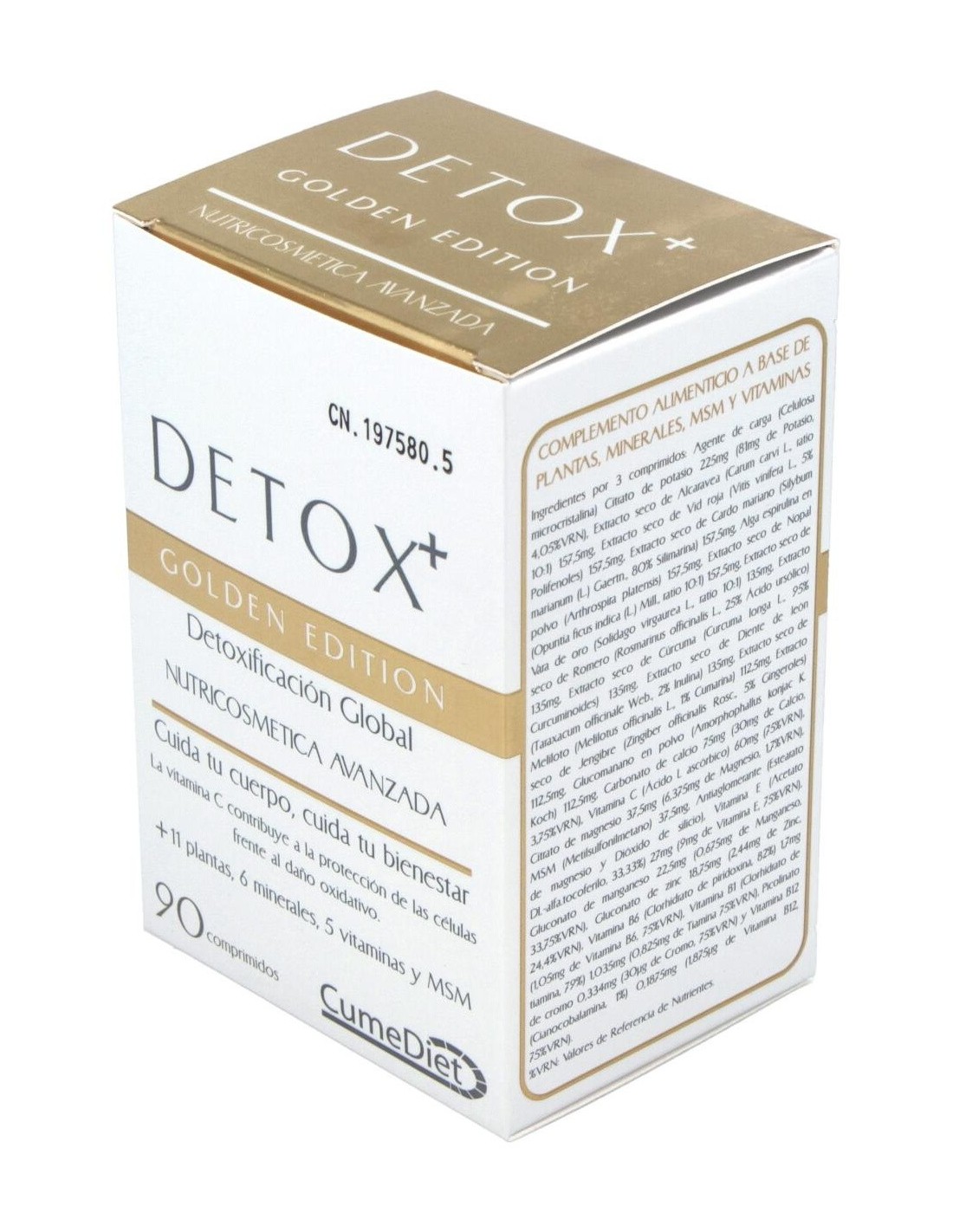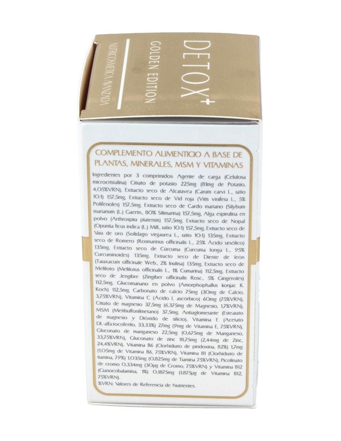 Citrato de potasio 36 % k 225 mg: Alcaravea (Carum carvi, frutos) 157,50 mg: Vid roja (Vitis vinifera, hojas) 157,50 mg: Cardo mariano (Sylibum marianum, semillas) 157,50 mg: alga Espirulina (Arthrospira platensis) polvo 157,50 mg: Nopal (Opuntia ficus indica, planta entera) 157,50 mg: Vara de oro (Solidago virgaurea, hierba cortada) 135 mg: Romero (Rosmarinus officinalis, hojas) 135 mg: Cúrcuma (Curcuma longa, rizoma) 135 mg: Diente de león (Taraxacum officinale, raíz ) 135 mg: Meliloto (Melilotus officinalis, partes aéreas) 112,50 mg: Jengibre (Zingiber officinalis, raíz) 112,50 mg: Glucomanan (Amorphophallus konjac koch) polvo 112,50 mg: Carbonato de calcio 40 % 75 mg: Vitamina C (ácido l ascórbico) 60 mg: Citrato de magnesio 17% Mg. 37,50 mg: MSM (metilsulfonilmetano) 37,50 mg: Vitamina E (acetato de dl-alfa-tocoferilo 33,33%) 27 mg: Gluconato de manganeso 12% Mn. 22,50 mg: Gluconato de zinc 13% Zn. 19,50 mg: Vitamina B6 (clorhidrato de piridoxina 82%) 1,28 mg: Vitamina B1 (clorhidra de tiamina 79%) 1,04 mg: Picolinato de cromo 12% Cr. 0,25 mg: Vitamina B12 (cianocobalamina 1%) 0,19 mg.