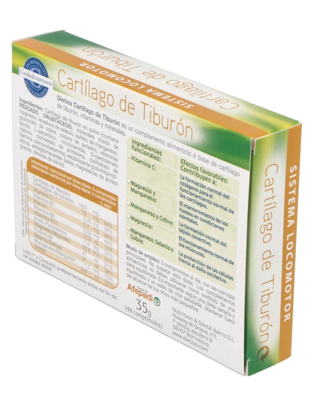 Complemento alimenticio a base de cartílago de tiburón, vitaminas y minerales que ayuda a mantener la función normal del tejido conectivo, propio de cartílagos, huesos y ligamentos. Complemento alimenticio a base de cartílago de tiburón, vitaminas y minerales que ayuda a mantener la función normal del tejido conectivo, propio de cartílagos, huesos y ligamentos.