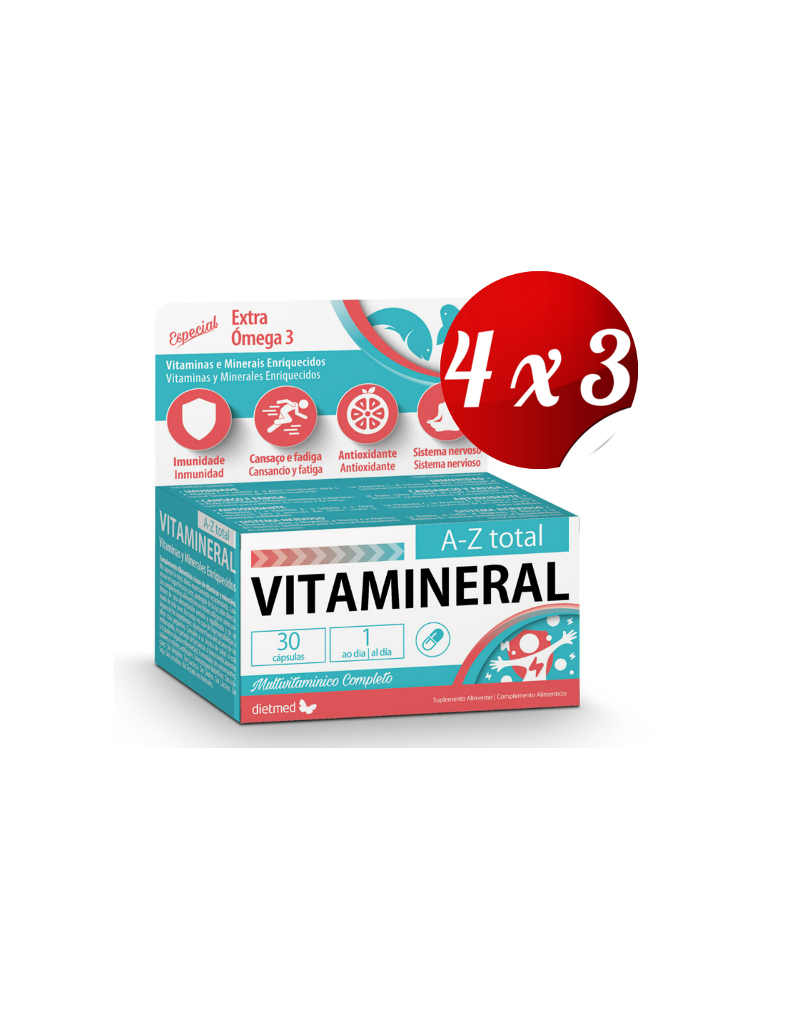 El Pack 4x3 uds Vitamineral A-Z Total 30Perlas de Dietme está diseñado para personas que buscan complementar su alimentación diaria con una fórmula completa de vitaminas y minerales. Este producto es adecuado para quienes desean mantener un aporte equilibrado de nutrientes esenciales en su rutina.