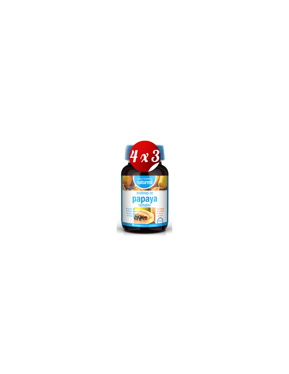 - Cada envase contiene 90 comprimidos formulados con enzimas derivadas de la papaya, facilitando la descomposición de nutrientes durante la digestión.