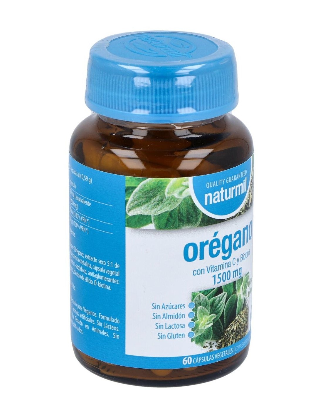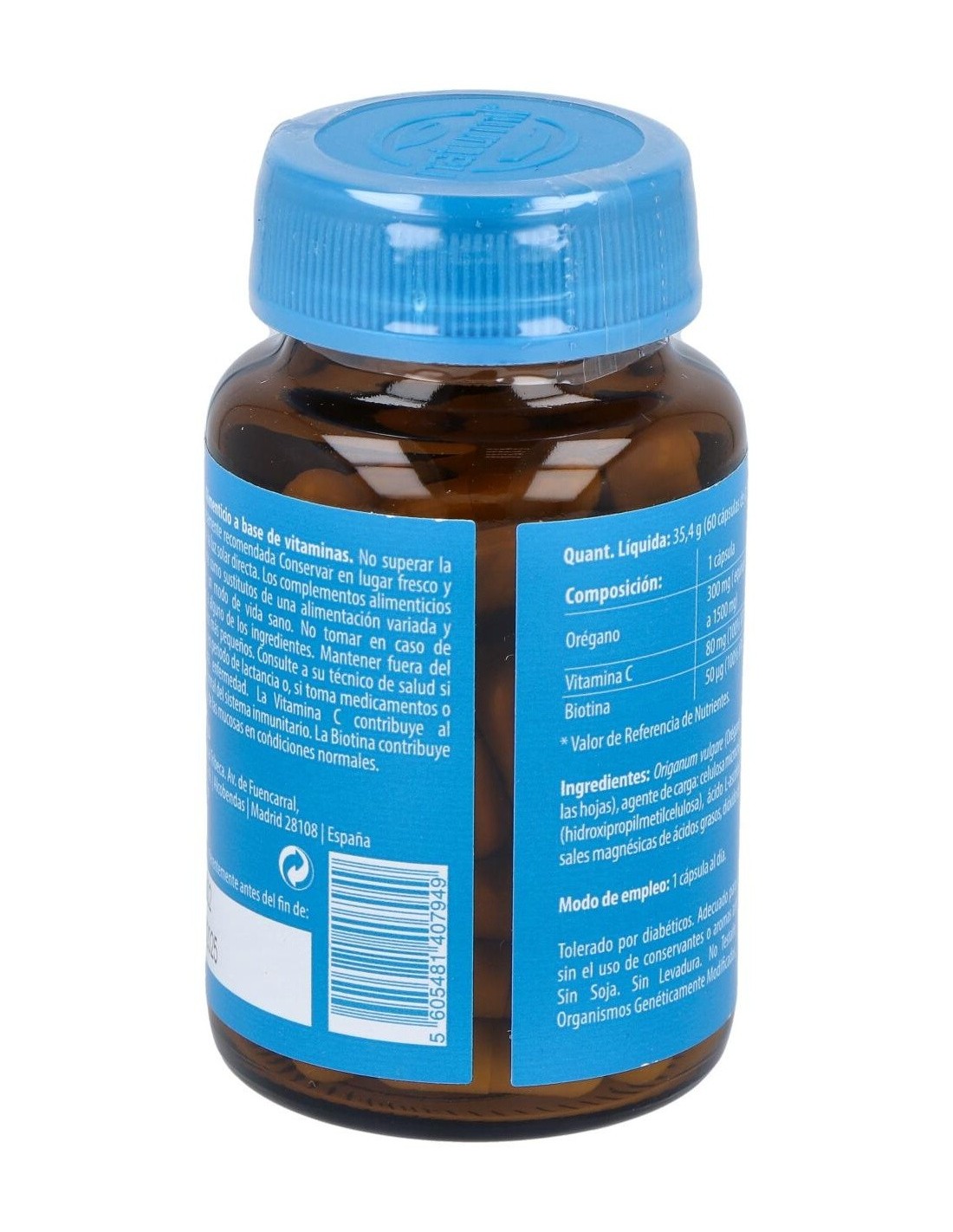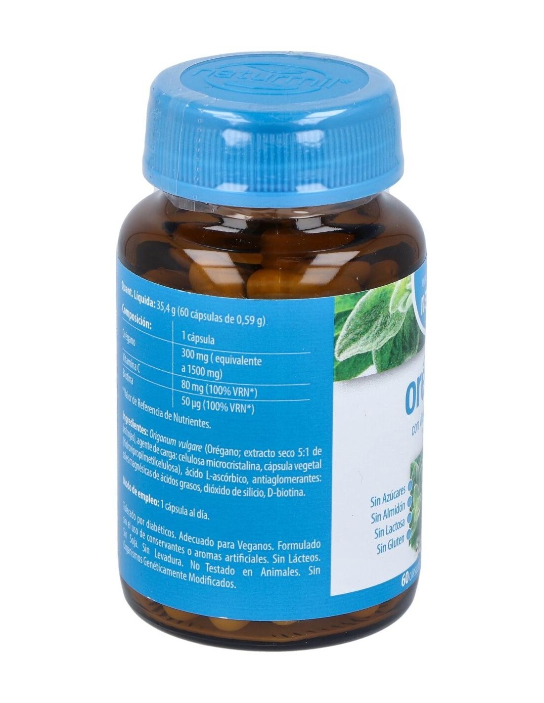 Ingredientes:Origanum vulgare (Orégano; extracto seco 5:1 de las hojas), agente de carga: celulosa microcristalina, cápsula vegetal (hidroxipropilmetilcelulosa), ácido L-ascórbico, antiaglomerantes: sales magnésicas de ácidos grasos, dióxido de silicio, D-biotina.Modo de empleo:Tomar 1 cápsula al día.Presentación:Envase de 60 cápsulas vegetales.Recomendaciones y advertencias:Apto para veganos. No contiene azúcares, almidón, gluten ni lactosa.
