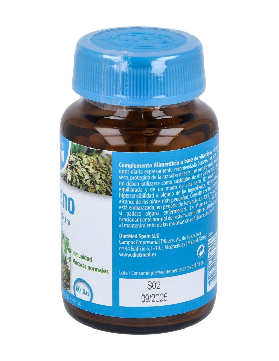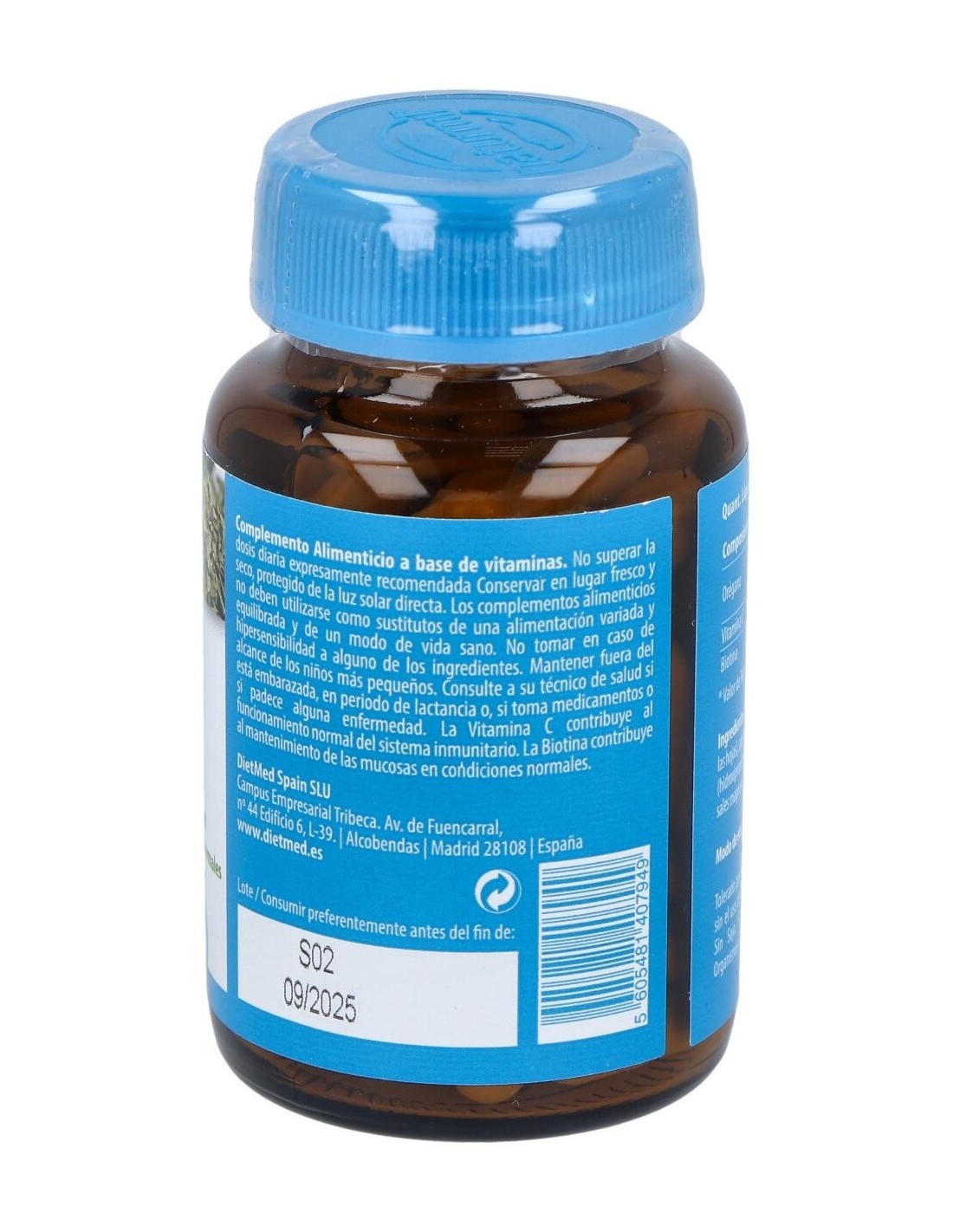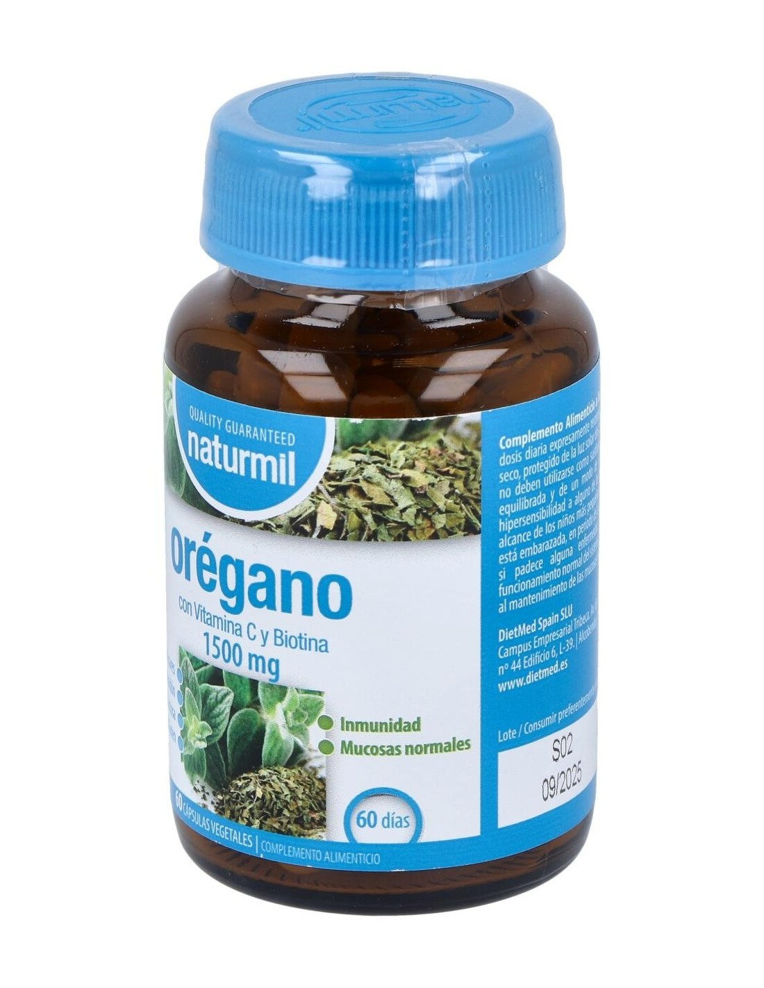 Ingredientes:Origanum vulgare (Orégano; extracto seco 5:1 de las hojas), agente de carga: celulosa microcristalina, cápsula vegetal (hidroxipropilmetilcelulosa), ácido L-ascórbico, antiaglomerantes: sales magnésicas de ácidos grasos, dióxido de silicio, D-biotina.Modo de empleo:Tomar 1 cápsula al día.Presentación:Envase de 60 cápsulas vegetales.Recomendaciones y advertencias:Apto para veganos. No contiene azúcares, almidón, gluten ni lactosa.