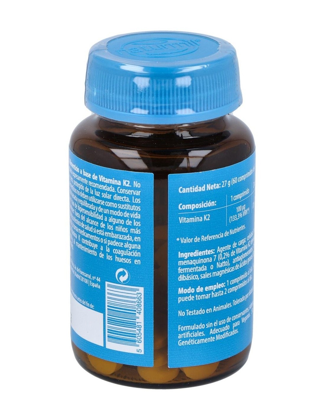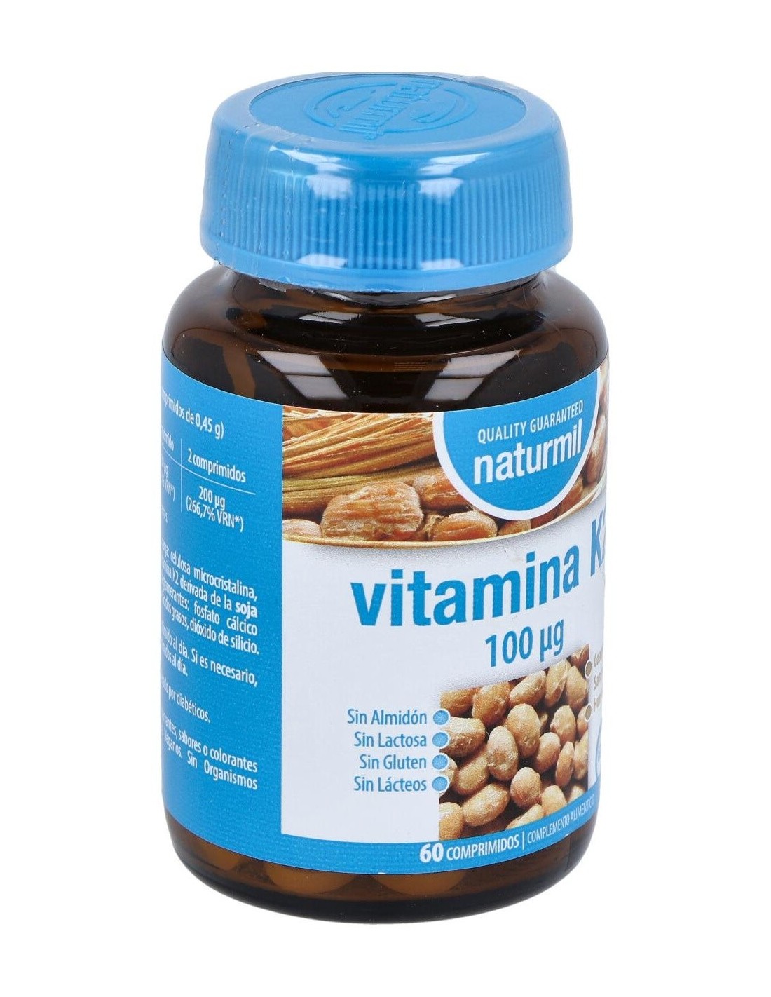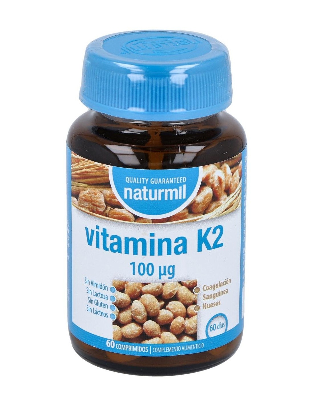 La Vitamina K contribuye a la coagulación sanguínea normal y al mantenimiento de los huesos en condiciones normales. Es recomendado en casos de anomalías en el metabolismo óseo, como osteopenia y osteoporosis, aterosclerosis y para normalización de la coagulación sanguínea.Composición activa por comprimido:100 mcg de vitamina K2.Ingredientes:Agente de carga: celulosa microcristalina, menaquinona 7 (0,2% de Vitamina K2 derivada de la soja fermentada o Natto), antiaglomerantes: fosfato cálcico dibásico, magnesio estearato, dióxido de silicio.Modo de empleo:Tomar 1 comprimido al día, antes de la comida.Presentación:Envase de 60 comprimidos.Recomendaciones y advertencias:No contiene gluten ni lactosa.
