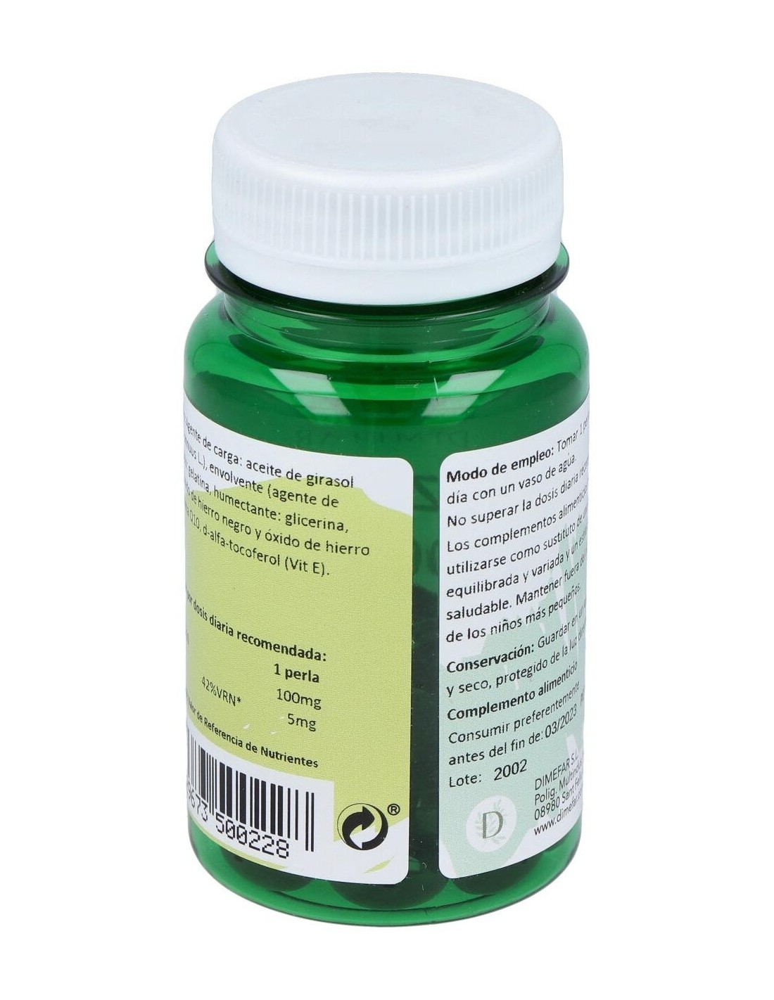 Dimefar Coenzima Q 10 Plus 30 Perlas es un complemento alimenticio con vitamina E y 100mg de CoQ10 obtenida por fermentación. Este producto presenta un potente poder antioxidante y protector cardiovascular.