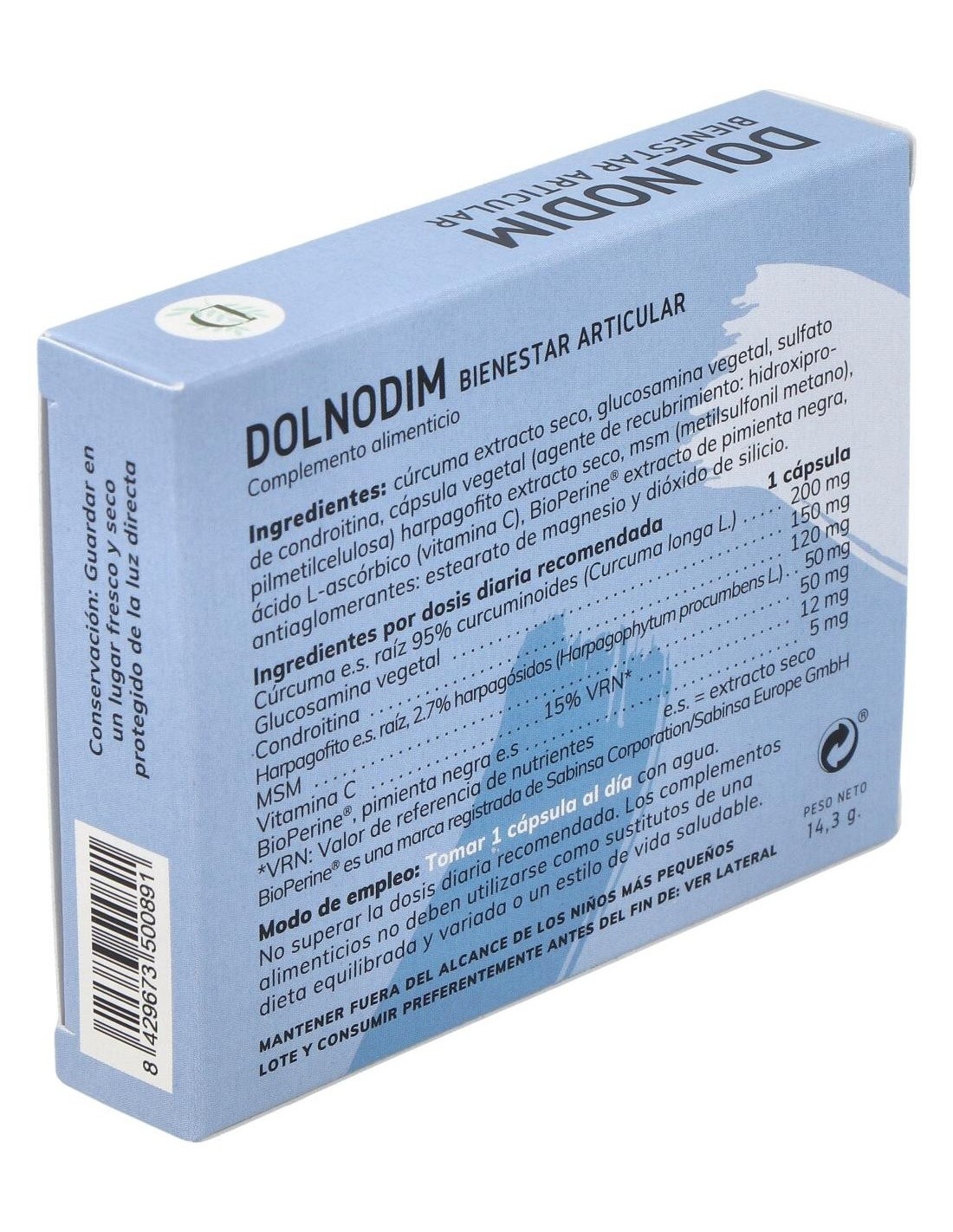 Cúrcuma extracto seco, glucosamina vegetal, sulfato de condroitina, cápsula vegetal (agente de recubrimiento: hidroxipropilmetilcelulosa), harpagofito extracto seco, msm (metilsulfonil metano), ácido L-ascórbico (vitamina C), BioPerine® extracto de pimienta negra, antiaglomerantes: estearato de magnesio y dióxido de silicio.