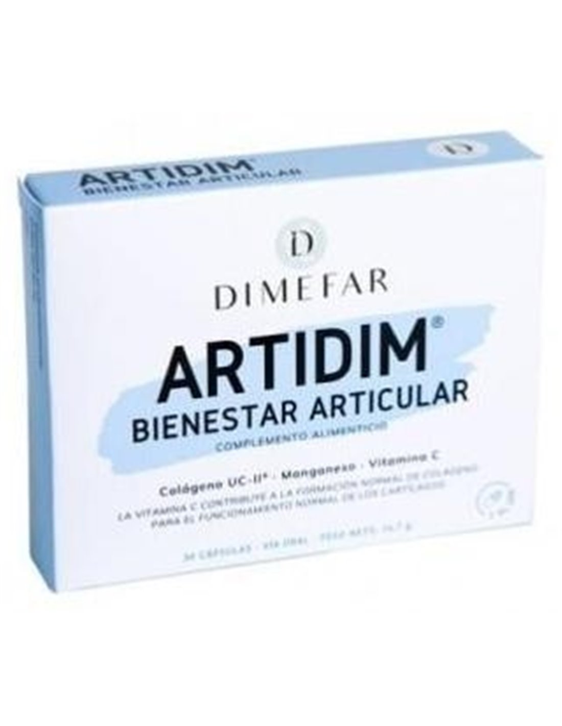 Dimefar Artidim 30Cáps es un complemento alimenticio a base de colágeno tipo II no hidrolizado, manganeso y vitamina C que contribuye a mantener la salud articular.