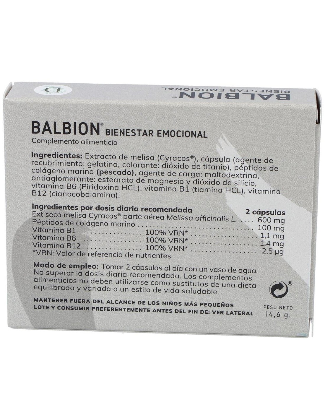 EXTRACTO DE MELISA (CYRACOS®), CÁPSULA (AGENTE DE RECUBRIMIENTO: GELATINA, COLORANTE: DIÓXIDO DE TITANIO), PÉPTIDOS DE COLÁGENO MARINO (PESCADO), AGENTE DE CARGA: MALTODEXTRINA, ANTIAGLOMERANTE: ESTEARATO DE MAGNESIO Y DIÓXIDO DE SILICIO, VITAMINA B6 (PIRIDOXINA HCL), VITAMINA B1 (TIAMINA HCL), VITAMINA B12 (CIANOCOBALAMINA).