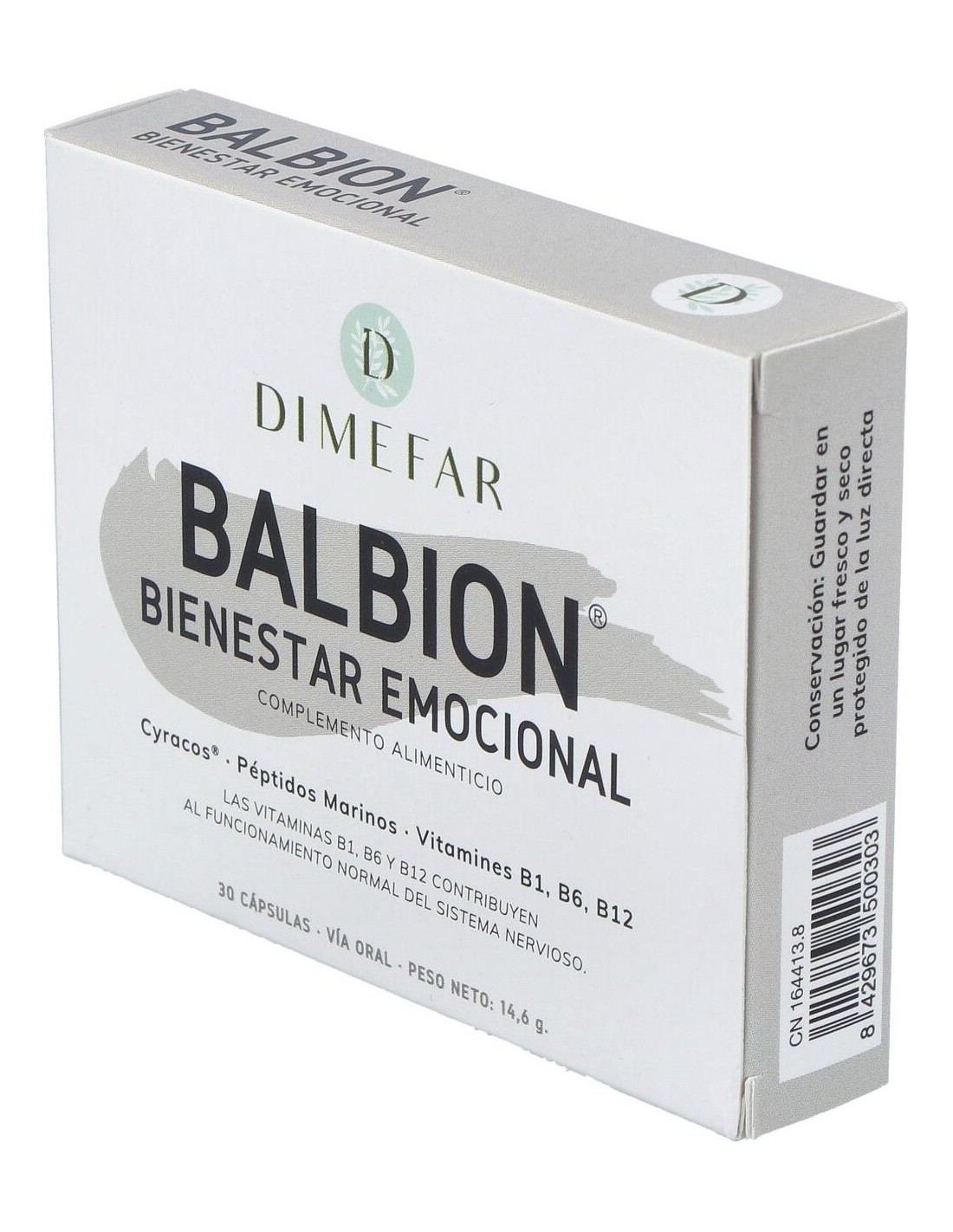Dimefar Balbion 30Cáps es un complemento alimenticio a base de extracto de melisa de alta calidad combinado con extracto de péptidos marinos y vitaminas del grupo B (B1, B6 y B12).