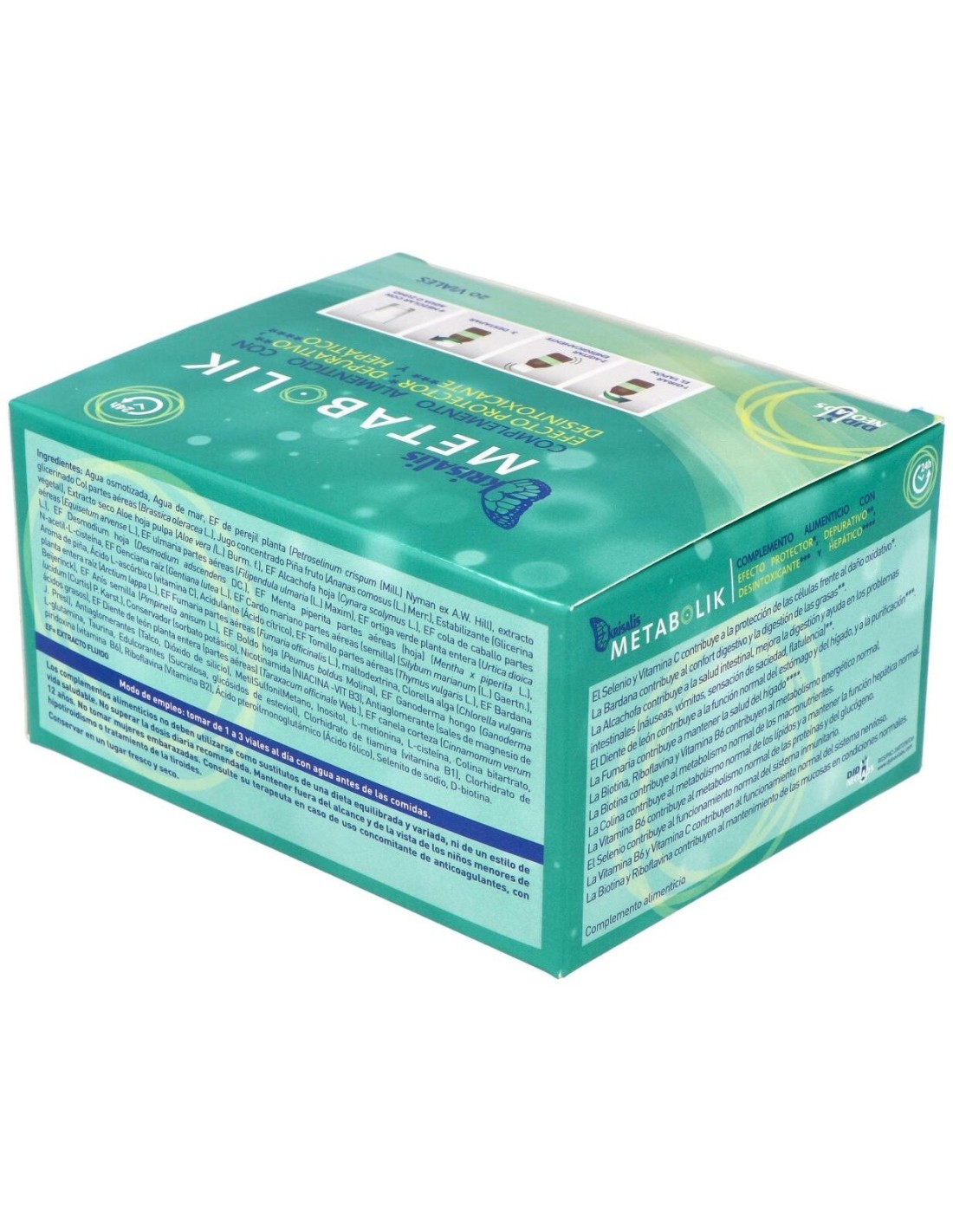 Ingredientes:Agua osmotizada, Agua de mar, extracto fluido de perejil planta (Petroselinum crispum (Mill.) Nyman ex A.W. Hill), extracto glicerinado Col partes aéreas (Brassica oleracea L.), Jugo concentrado Piña fruto (Ananas comosus (L.) Merr.), Estabilizante (Glicerina vegetal), Extracto seco Aloe hoja pulpa (Aloe vera (L.) Burm. f.J, extracto fluido Alcachofa hoja (Cynara scolymus L.), extracto fluido cola de caballo partes aéreas (Equisetum arvense L.), extracto fluido ulmaria partes aéreas (Filipendula ulmaria (L.) Maxim), extracto fluido ortiga verde planta entera (Urtica dioica L.). extracto fluido Desmodium hoja (Desmodium adscendens DC.), extracto fluido Menta piperita partes aéreas (hoja) (Mentha × piperita L.), N-acetil-L-cisteína, extracto fluido Genciana raíz (Gentiana lutea L.I, extracto fluido Cardo mariano partes aéreas (semilla) (Silybum marianum (L.) Gaertn.), Aroma de piña, Ácido L-ascórbico (vitamina C), Acidulante (Ácido cítrico), extracto fluido Tomillo partes aéreas (Thymus vulgaris L.), extracto fluido Bardana planta entera raiz (Arctium lappa L.), extracto fluido Fumaria partes aéreas (Fumaria officinalis L.), maltodextrina, Clorella alga (Chlorella vulgaris Beijerinck), extracto fluido Anis semilla (Pimpinella anisum L.I, extracto fluido Boldo hoja (Peumus boldus Molina), extracto fluido Ganoderma hongo (Ganoderma lucidum (Curtis) P. Karst.), Conservador (sorbato potásico), Nicotinamida (NIACINA - VIT B3), Antiaglomerante (sales de magnesio de ácidos grasos), extracto fluido Diente de león planta entera (partes aéreas) (Taraxacum officinale Web.), extracto fluido canela corteza (Cinnamomum verum J. Presl). Antiaglomerantes (Talco, Dióxido de silicio), MetilSulfonilMetano, Inositol, L-metionina, L-cisteína, Colina bitartrato, L-glutamina, Taurina, Edulcorantes (Sucralosa, glicósidos de esteviol), Clorhidrato de tiamina (vitamina B11. Clorhidrato de piridoxina (vitamina B6), Riboflavina (Vitamina B2), Ácido pteroilmonoglutámico (Ácido fólico), Selenito de sodio, D-biotina.Modo de empleo:Tomar de 1 a 3 viales al día, mezclado con un vaso de agua o zumo de 300 ml. La ingesta más adecuada es a media mañana (10:00 / 11:00 h. ) y a media tarde (17:00-18:00 h).