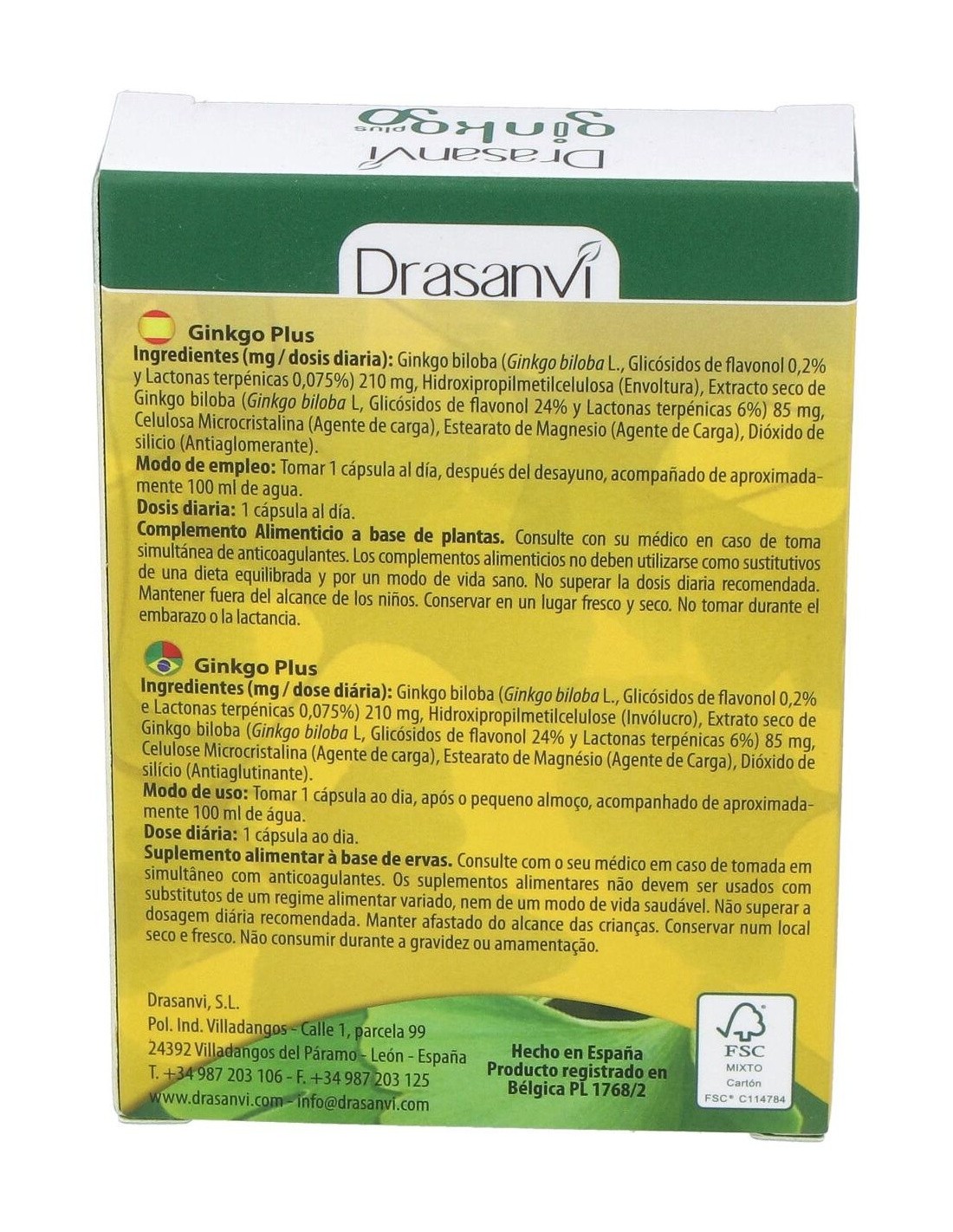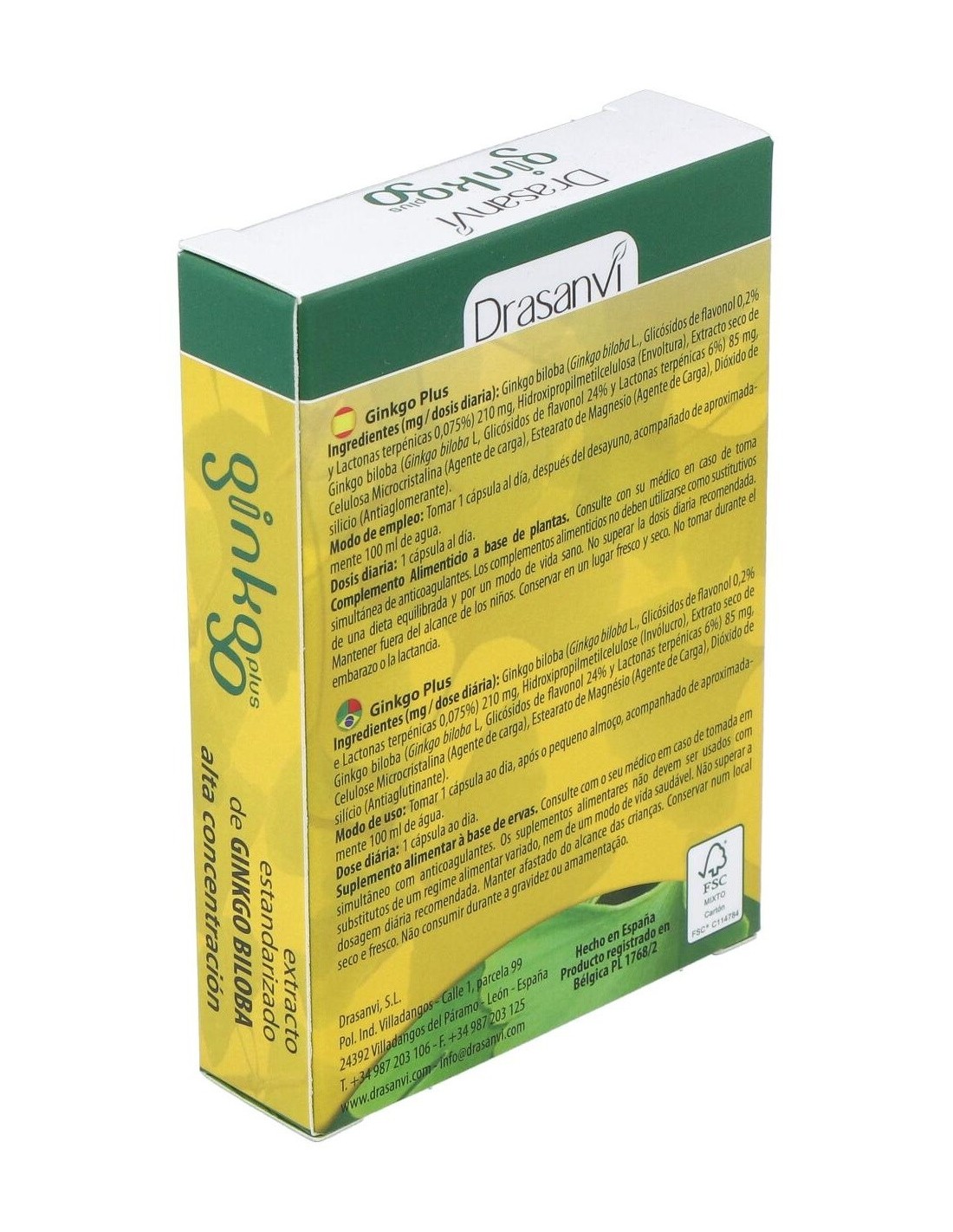 210 mg de polvo de ginkgo biloba (0,2% en ginkgoflavonoides y 0,075% de lactonas).