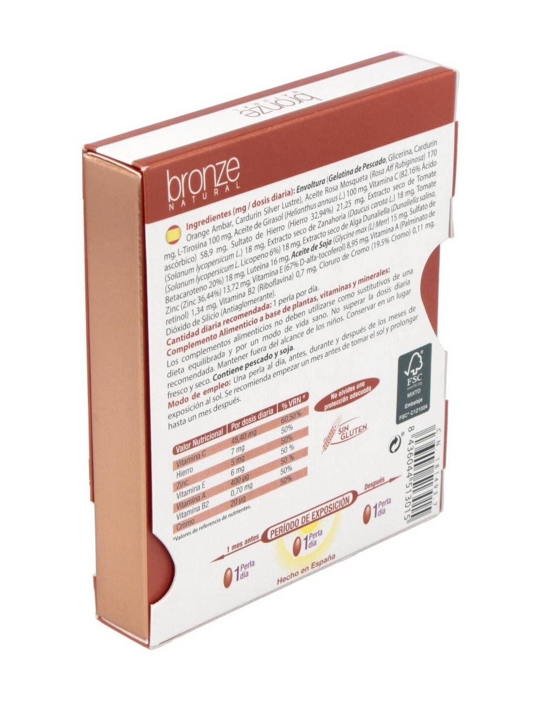 Activación de la síntesis de la melanina.La melanina es el pigmento, cuya cantidad y distribución nos determina la intensidad de tonalidad de nuestra piel, de manera que una persona con una gran cantidad de melanina es más morena que las personas con menos porcentaje de esta en la piel. El punto de partida de la melanina es la tirosina, una aminoácido esencial, que es necesario consumir en la dieta. Para que la tirosina de lugar a melanina son necesarios unos correctos niveles de riboflavina (vitamina B2), cromo, hierro y zinc. Antioxidante endógeno y antioxidante exógeno.El Sol es una fuente de vida y tan necesario que en ocasiones sustituye a muchas terapias, pero el Sol en exceso provoca envejecimiento prematuro de la piel al crear una piel más vulnerable. Desde hace años se utiliza antioxidantes del tipo Beta-Carotenos (extracto seco de zanahoria), Licopeno (extracto seco de tomate) y Luteína (extracto seco de Dunaliella). El aporte de Vitamina A, C y E, también constituyen una fuente de antioxidantes que luchan contra los radicales libres que causan envejecimiento prematuro en la piel. Las propiedades antioxidantes de Bronze son de dos tipos, aumentando así la capacidad antioxidante: