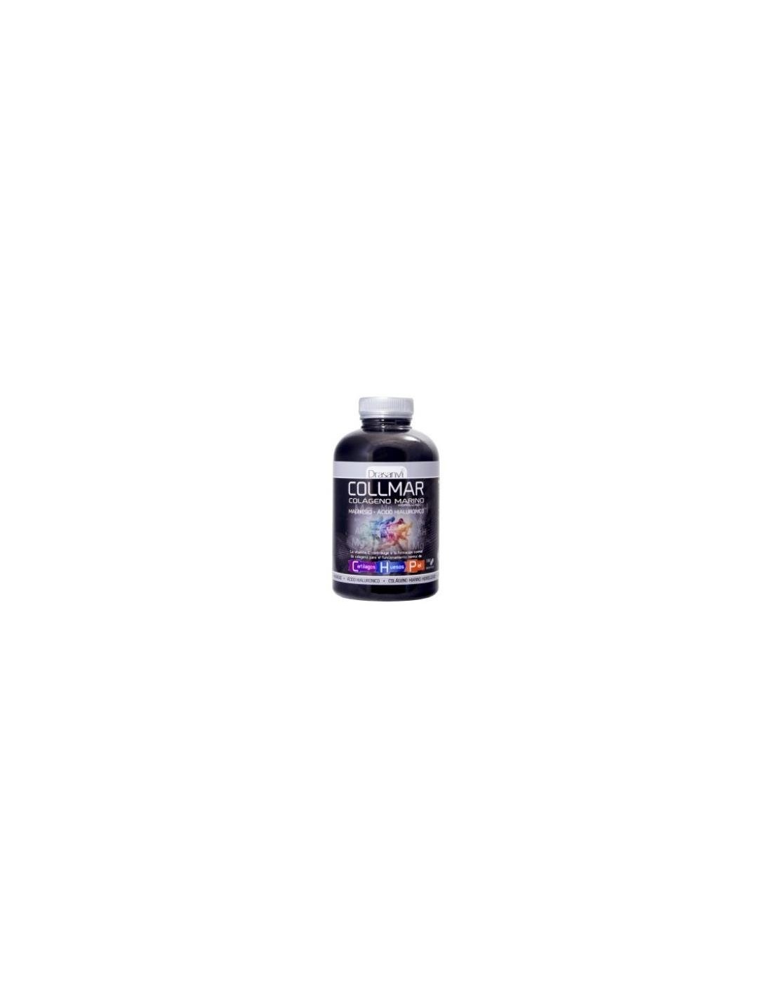 El colágeno es esencial para la elasticidad y la flexibilidad de los órganos y para la integridad de las estructuras. La fibra de colágeno se mezcla con facilidad con una amplia gama de sustancias y minerales produciendo notables efectos en la arquitectura tisular. Como ejemplo, en la estructura de la piel, el colágeno y la elastina forman una red. En los huesos, el colágeno se mezcla con cristales de calcio, proporcionando una estructura rígida. En los cartílagos, se combina con la elastina y matriz extracelular, creando un gel que absorbe los impactos entre las articulaciones. El 99% del total del colágeno presente en nuestro cuerpo se encuentra en los diferentes tejidos conectivos como son los tendones, los ligamentos, la piel, el cartílago, la estructura de los ojos y prácticamente todos los órganos internos, superficie de las células, cabello y placenta. El colágeno se corresponde aproximadamente al 7% de nuestra masa corporal. Sólo en la piel, nuestro órgano más grande, el colágeno estaría representando en el 70% de su peso. Además del cartílago en un 67%, pulmones 10% e hígado 4%, entre los más importantes. Caracteristicas principales de Collmar con Magnesio:- El Colágeno Marino y la riqueza de los Aminoácidos.El colágeno utilizado proviene de peces. Un reciente estudio (J Agric Food Chem 55(4) 1532-1535 (2007)) ha demostrado que el colágeno marino se asimila más fácilmente que otras fuentes de colágeno, como el porcino. Collmar® posee un alto un alto porcentaje de Glicina, Prolina e Hidroxiprolina (aminoácidos mayoritarios del colágeno) y aminoácidos esenciales. - Hidrolizado Enzimaticamente.El colágeno utilizado ha sido sometido a un proceso único que consiste en fragmentarlo en moléculas más pequeñas, llamadas péptidos, para que sean más fácilmente asimilables por el organismo. Este proceso se ha realizado por hidrólisis enzimática. De esta forma conseguimos romper el colágeno en lugares específicos facilitando su absorción. - Enriquecido con ácido hialurónico.Collmar® está enriquecido con ácido hialurónico que procede de fermentación bacteriana de Streptococcus zooepidemicus. - Presencia de Vitamina C.La EFSA (European Food Safety Authority), recomienda el consumo de vitamina C, ya que contribuye a la formación del colágeno, el cual entra a formar parte de cartílago, huesos y piel. - Con Magnesio.La dosis diaria de 6 comprimidos, aporta un 66% de magnesio. El magnesio es un mineral esencial que, entre otras funciones, contribuye al mantenimiento de los huesos y músculos en condiciones normales, así como a la síntesis proteica normal. - Libre de animales terrestres.Todos los ingredientes utilizados (Colágeno Marino y Ácido Hialurónico) no provienen de animales terrestres. Composición por dosis diaria recomendada (6 comprimidos):