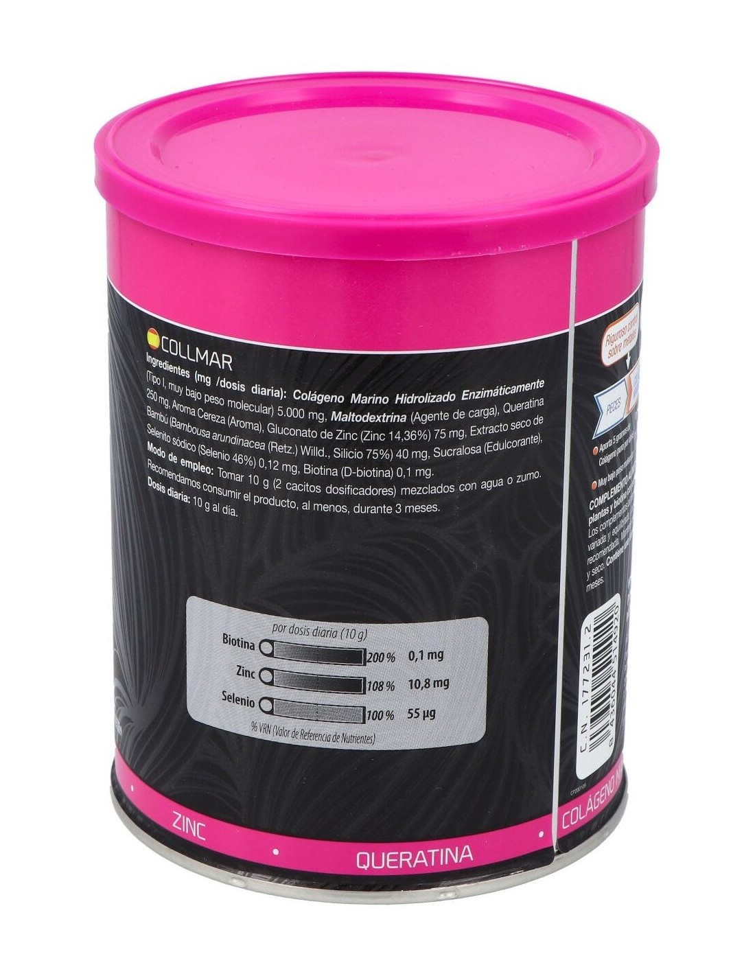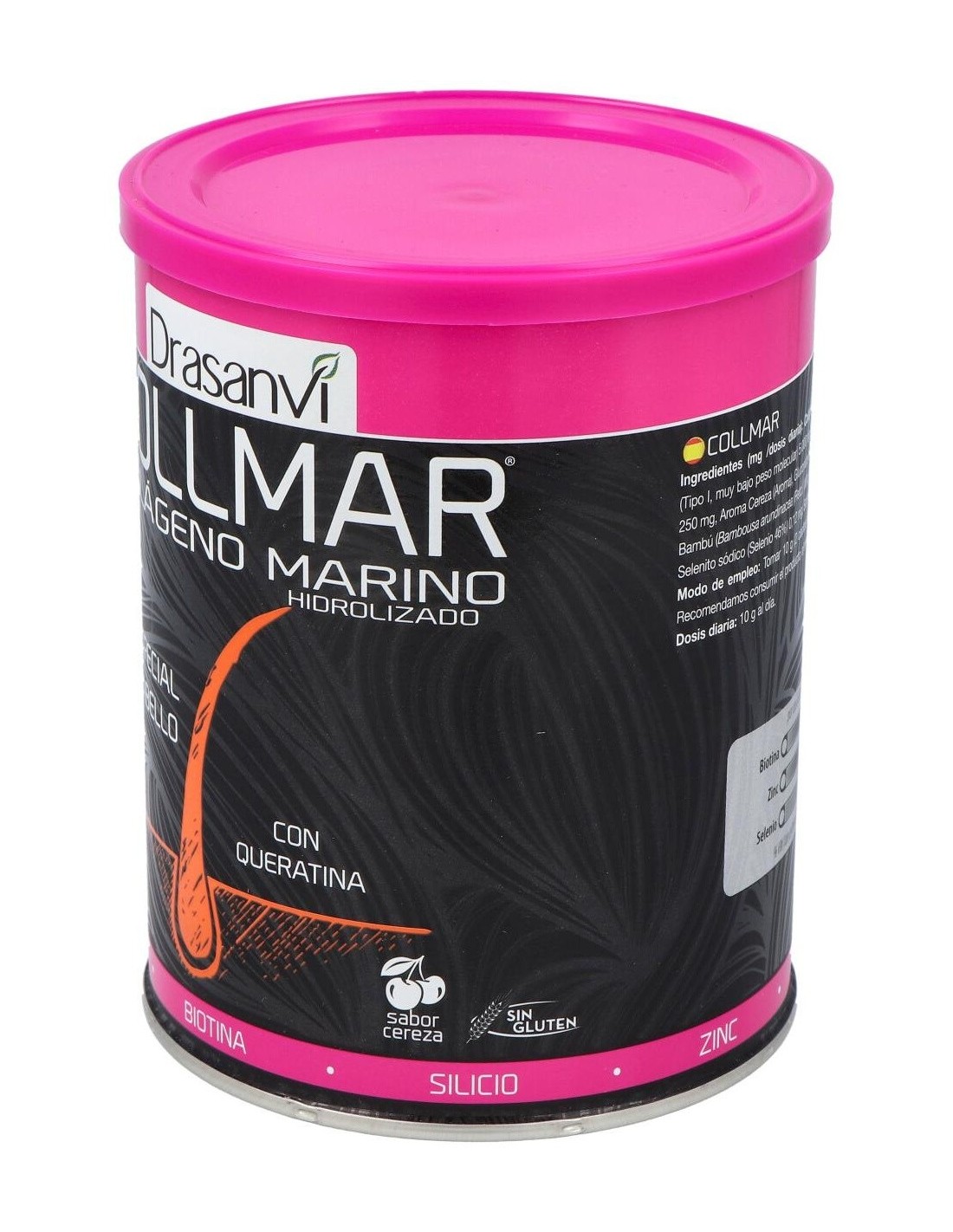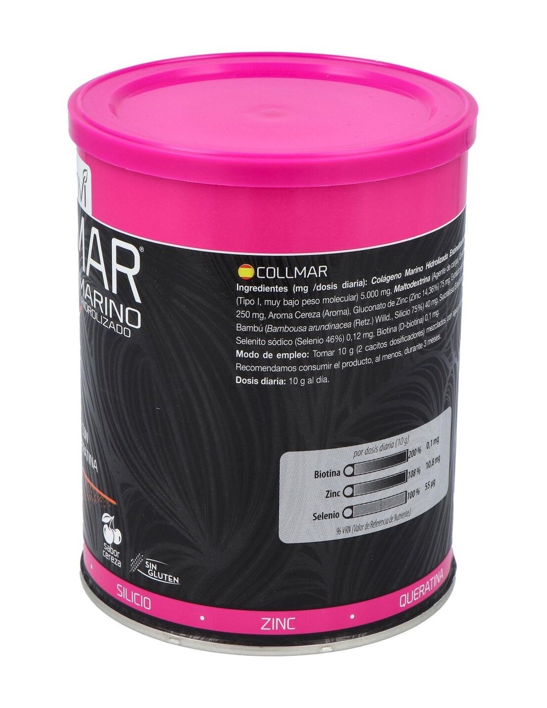 Ingredientes:Cola´geno Marino Hidrolizado Enzima´ticamente (Contiene pescado, Tipo I, muy bajo peso molecular)(5.000 mg), Agente de carga (Maltodextrina), Queratina (250 mg), Aroma (Aroma de cereza), Gluconato de Zinc (Zinc 14,36%)(75 mg), Extracto seco de Bambu´ (Tallo) (Bambousa arundinacea (Retz.) Willd., Silicio 75%)(40 mg), Edulcorante (Sucralosa), Selenito so´dico (Selenio 46%)(0,12 mg), Biotina (D-biotina)(100 mcg).Modo de empleo:Tomar 10 gramos (2 cacitos dosificadores) al día durante un tiempo mínimo de 3 meses continuados. Presentación:Envase de 350 gramos sabor cereza.Recomendaciones y advertencias:No contiene gluten.