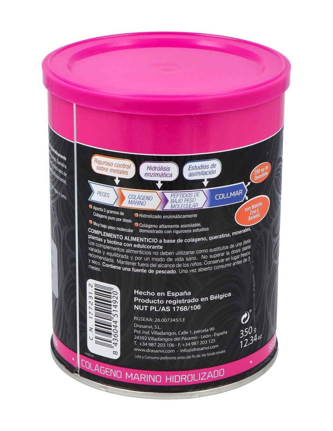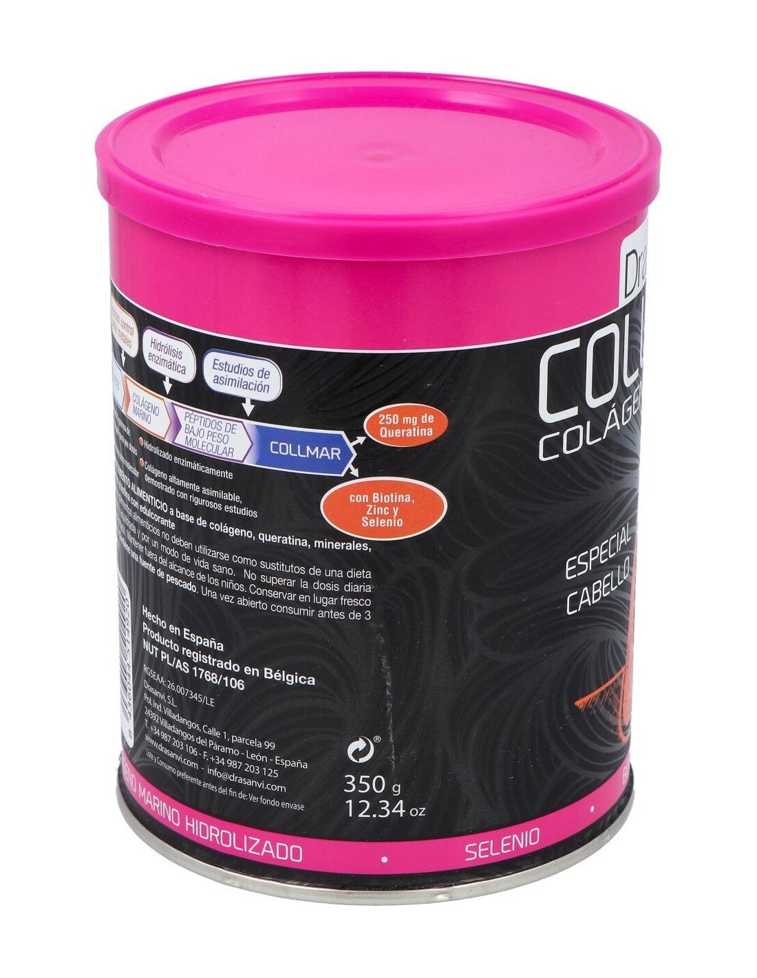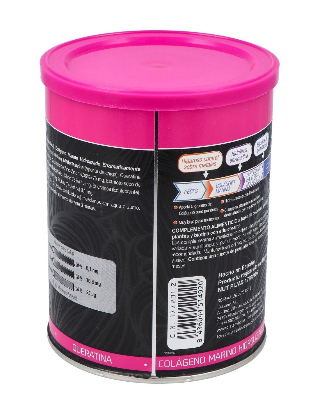 Ingredientes:Cola´geno Marino Hidrolizado Enzima´ticamente (Contiene pescado, Tipo I, muy bajo peso molecular)(5.000 mg), Agente de carga (Maltodextrina), Queratina (250 mg), Aroma (Aroma de cereza), Gluconato de Zinc (Zinc 14,36%)(75 mg), Extracto seco de Bambu´ (Tallo) (Bambousa arundinacea (Retz.) Willd., Silicio 75%)(40 mg), Edulcorante (Sucralosa), Selenito so´dico (Selenio 46%)(0,12 mg), Biotina (D-biotina)(100 mcg).Modo de empleo:Tomar 10 gramos (2 cacitos dosificadores) al día durante un tiempo mínimo de 3 meses continuados. Presentación:Envase de 350 gramos sabor cereza.Recomendaciones y advertencias:No contiene gluten.