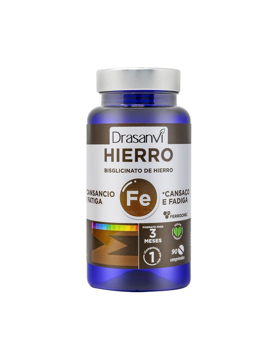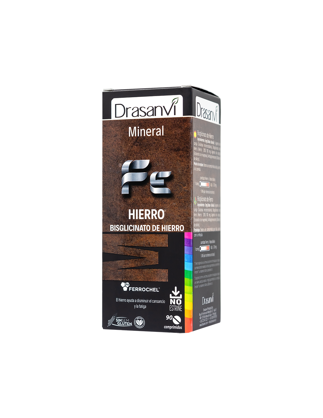 El Hierro es un mineral esencial para la vida y relacionado con numerosas funciones en el organismo. Puede ser el responsable de un cansancio extremo y relacionado con el sistema inmunitario entre otros.En muchas ocasiones los aportes de hierro tiene efectos secundarios sobre el organismo, entre los que se incluye las molestias estomacales y el estreñimiento. Con el fin de minimizar estos problemas hemos elegido Bisglicinato de Hierro, de la marca Ferrochel, la cual los estudios indican que se minimiza estos efectos.Composición activa por comprimido:20 mg de hierro.Ingredientes:Agente de carga (Celulosa microcristalina), Bisglicinato de hierro (Hierro 20%), Agente de carga (Sal magnésica de ácido graso), Antiaglomerante (Dióxido de silicio).Modo de empleo:Tomar 1 comprimido al día, junto con la comida. 90 comprimidos de 550 mg (50 g).Presentación:Envase de 90 comprimidos.Recomendaciones y advertencias:Producto vegano.