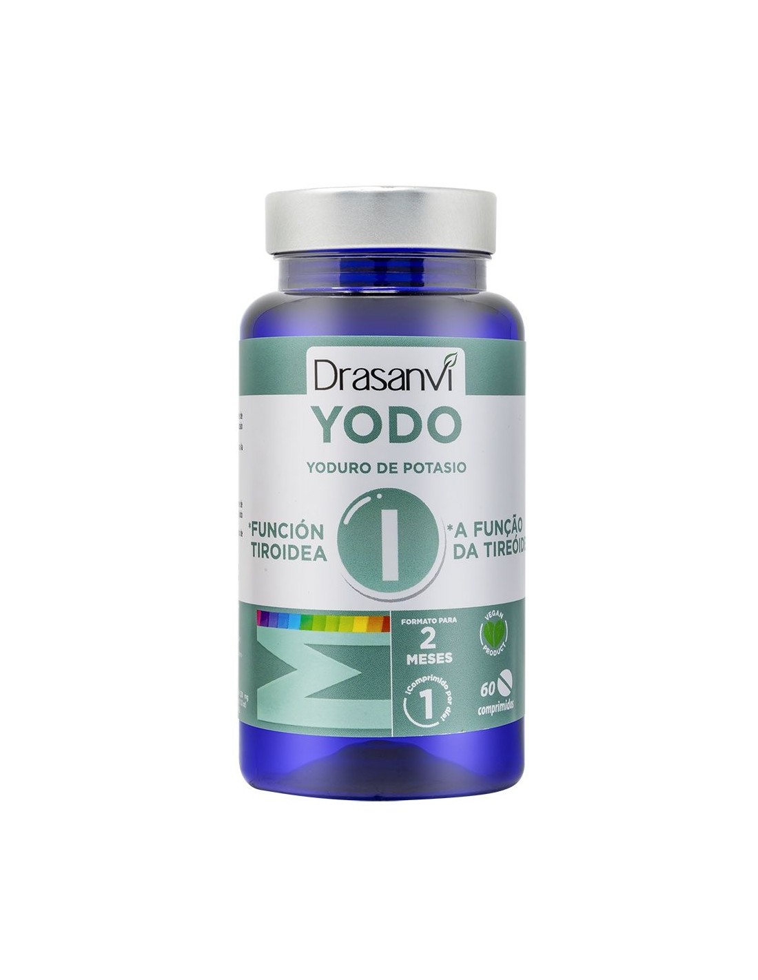 Yodo (Yoduro de Potasio) de Drasanvi es un complemento alimenticio que apoya la función tiroidea adecuada, contribuye a la producción de hormonas tiroideas, y ayuda en el metabolismo energético y el funcionamiento normal del sistema nervioso.Composición activa por comprimido:200 mcg de yodo.Ingredientes:Agente de carga (Celulosa microcristalina), Agente de carga (Sal magnésica de ácido graso), Yoduro de potasio (Yodo 76,5%).Modo de empleo:Tomar 1 comprimido al día, junto a la comida.Presentación:Envase de 60 comprimidos.Recomendaciones y advertencias:Producto vegano.