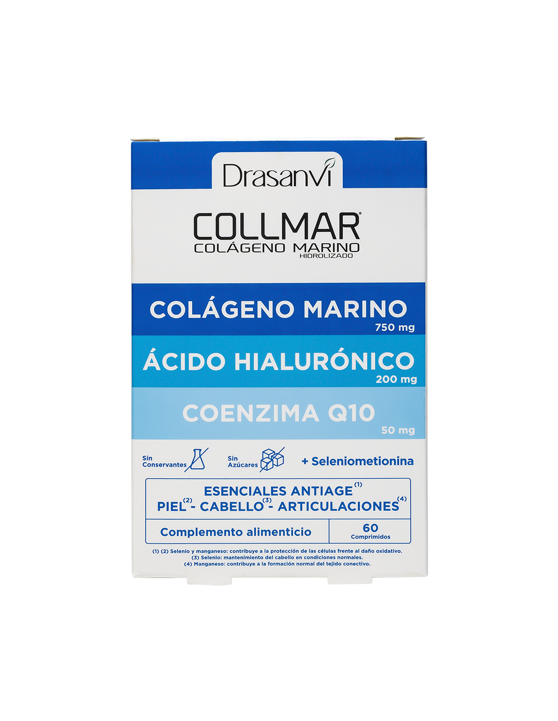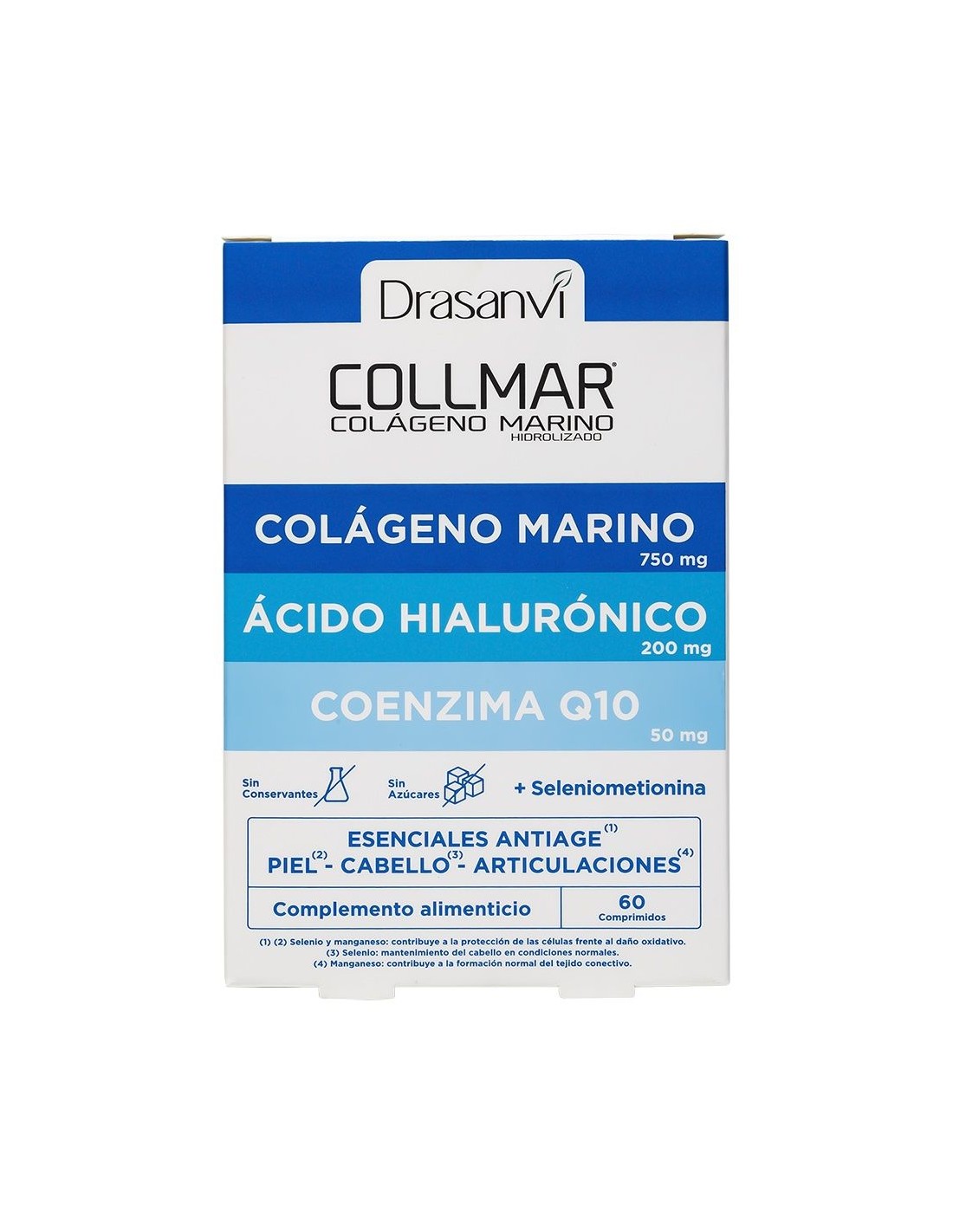 Ingredientes:Colágeno Marino Hidrolizado Enzimaticamente (Contiene Pescado Tipo I, muy bajo peso molecular) 750 mg, Agente de carga (Celulosa microcristalina), Ácido hialurónico 200 mg, Coenzima Q10 50 mg, Extracto Seco Sol de Oro (Flor) (Helichrysum arenarium (L), vitexina 3%) 50 mg, Sulfato de Manganeso (Manganeso 32 %) 6,25 mg, Seleniometionina (Selenio 0,5%) 10 mg, Agente de carga (Sal Magnésica de Ácido Graso).Modo de empleo:Tomar 2 comprimidos al día acompañados de un vaso de agua, antes del desayuno.Presentación:Envase de 60 comprimidos.Recomendaciones y advertencias:No contiene conservantes ni azúcares. Contiene pescado.