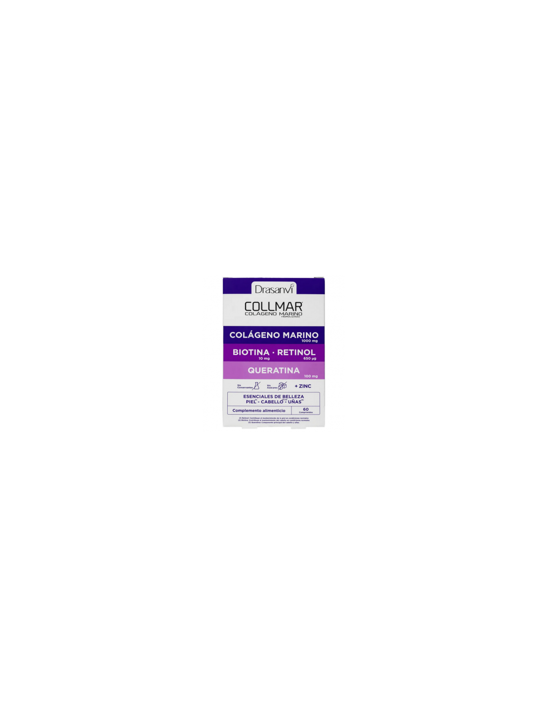 Collmar Esenciales Belleza de Drasanvi es una potente fórmula que combina colágeno, queratina, biotina, vitamina A, vitamina B6 y zinc, cuidadosamente seleccionados para fortalecer y embellecer tu cabello, uñas y piel desde adentro hacia afuera.El colágeno y la queratina trabajan en sinergia para fortalecer y revitalizar el cabello, mientras que la biotina estimula su crecimiento. Las vitaminas A y B6, junto con el zinc, promueven una piel radiante y uñas fuertes. Descubre el secreto para lucir un aspecto saludable y vibrante con nuestro complemento alimenticio de confianza.Composición activa por 2 comprimidos: