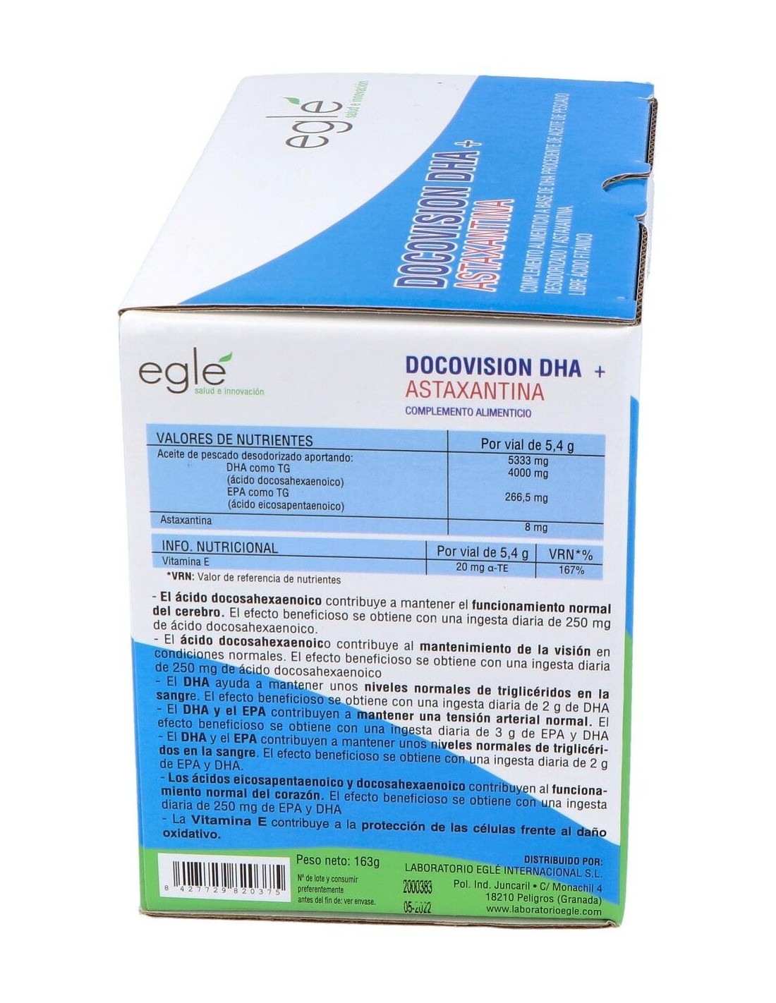 Docovision Dha + Astaxantina 30Amp. de Egle ofrece una combinación de componentes que apoyan aspectos importantes del bienestar cognitivo y visual, adaptándose a estilos de vida activos y conscientes.
