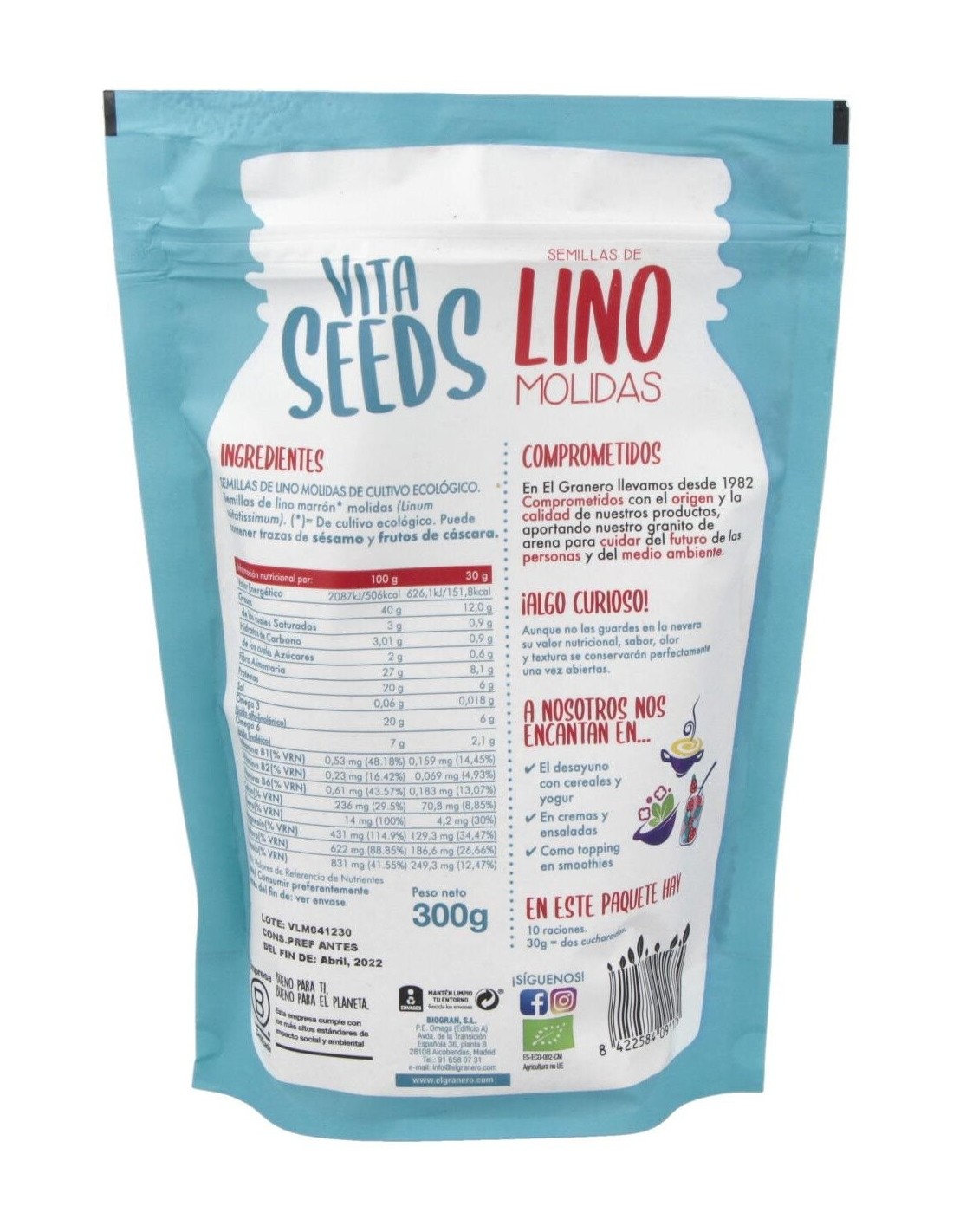 Vitaseeds Lino Molido 300Gr. Bio de El Granero es una opción natural para quienes buscan incorporar semillas de lino molidas en su alimentación diaria. Este producto está dirigido a personas interesadas en una dieta equilibrada y en el consumo de ingredientes de origen ecológico.
