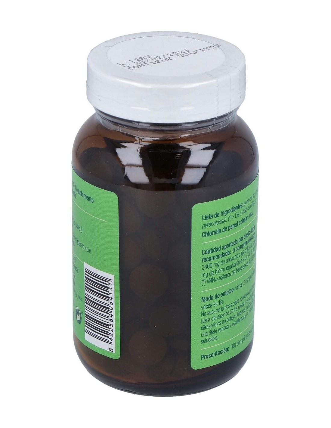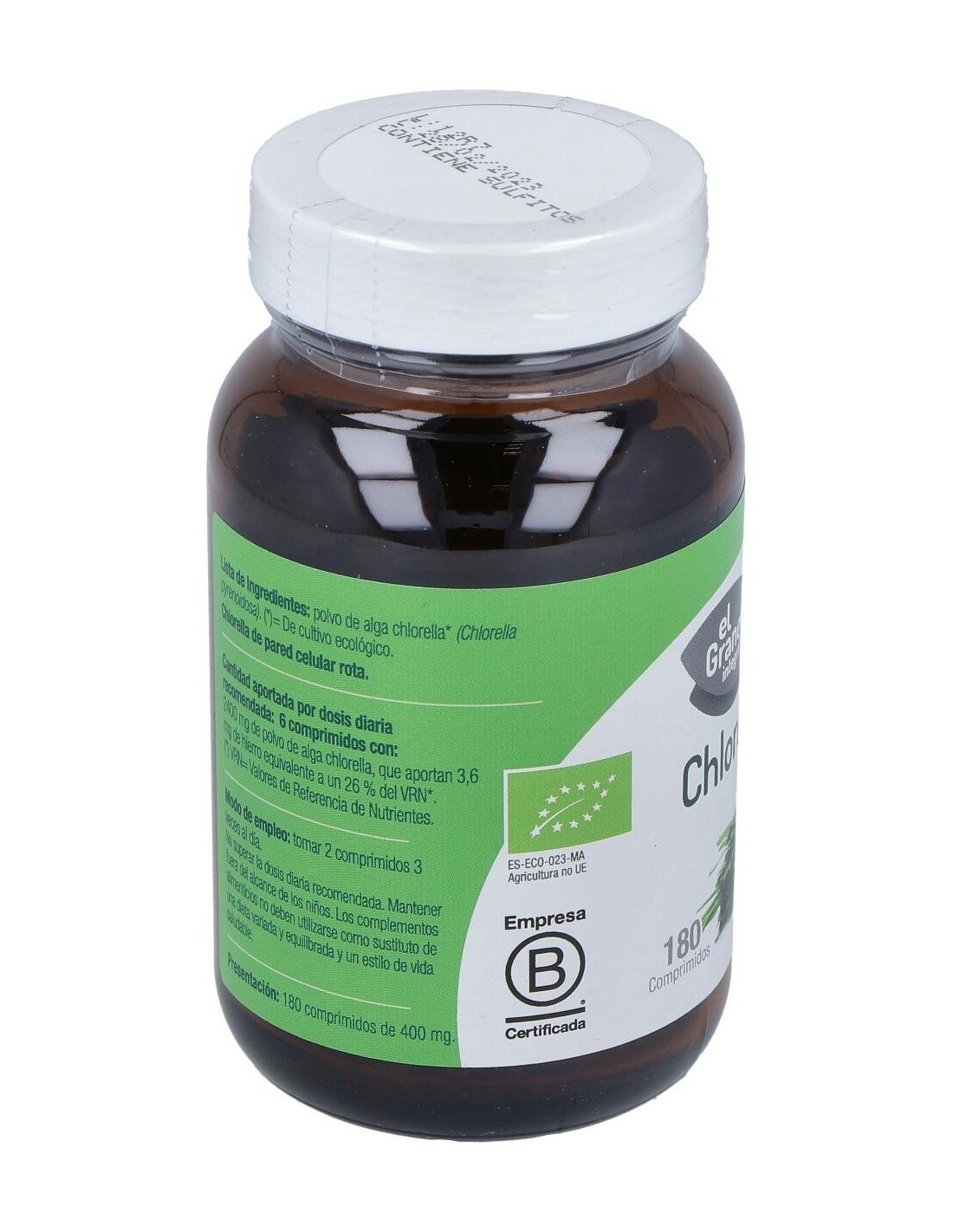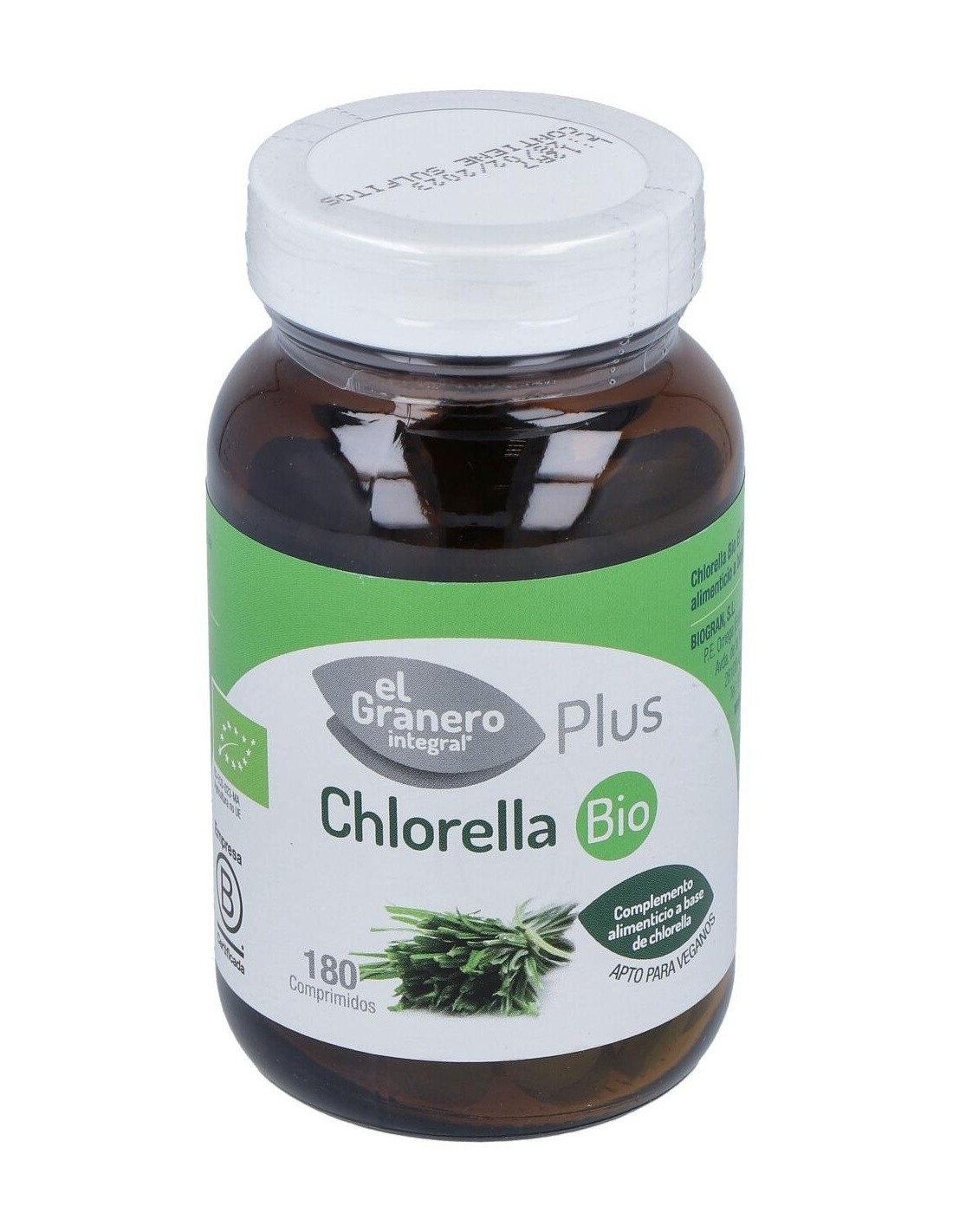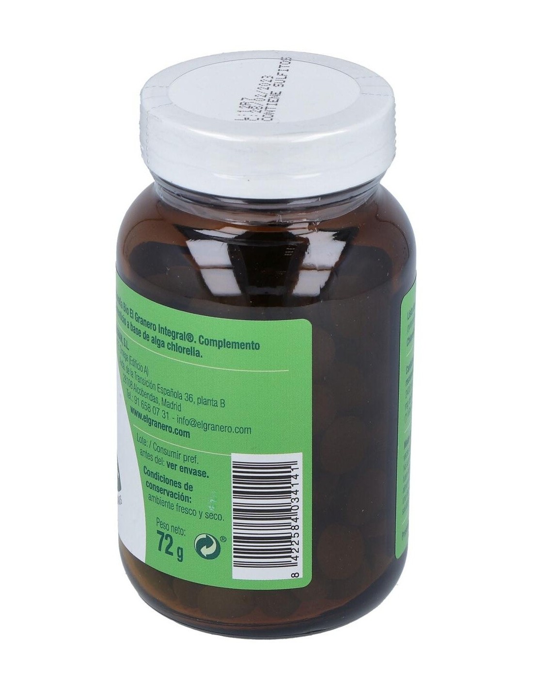 Composición por 6 comprimidos:2.400 mg de polvo de alga de chlorella de cultivo ecológico (de pared celular rota). Modo de empleo:Tomar 2 comprimidos 3 veces al día. Presentación:Bote de 180 comprimidos.