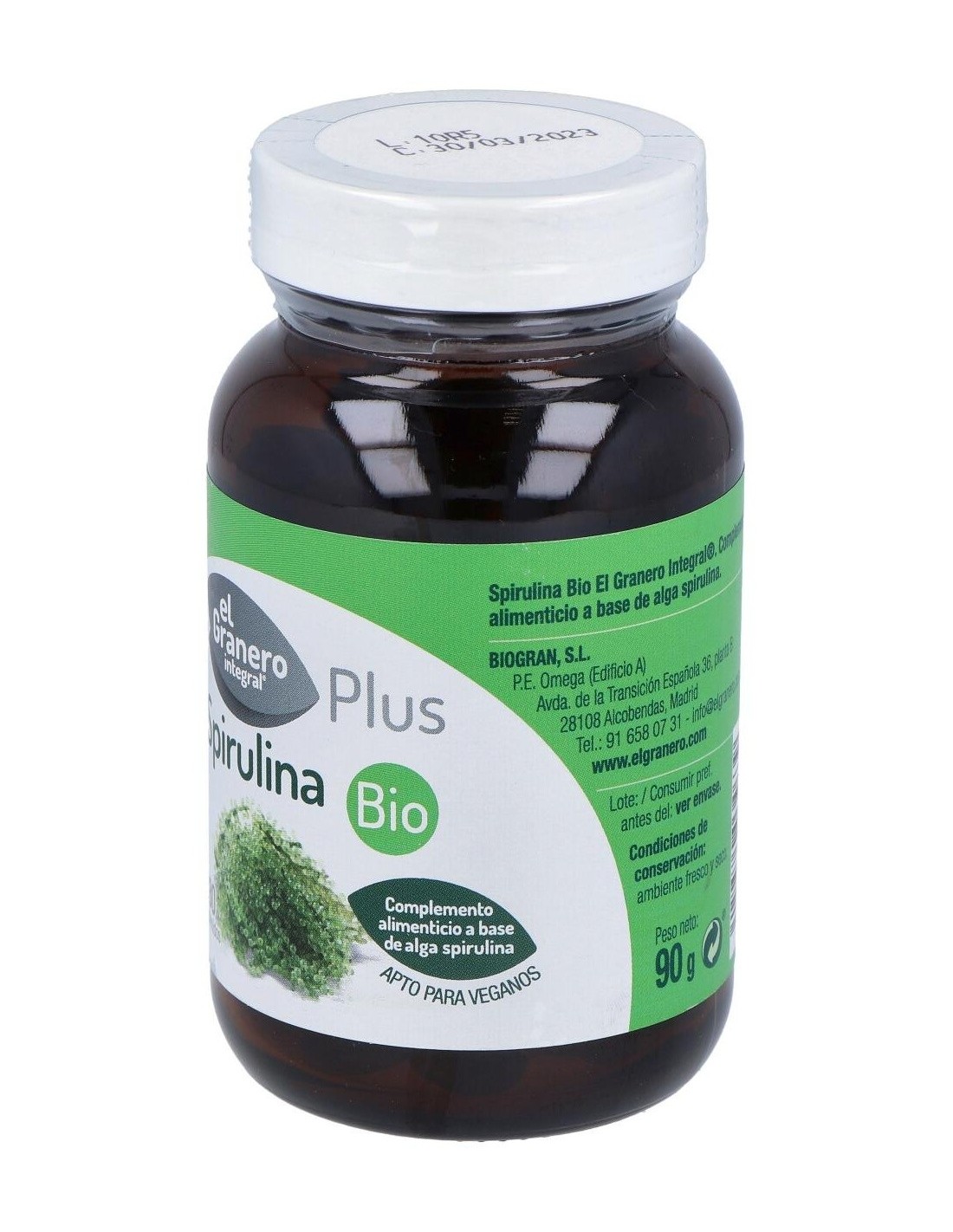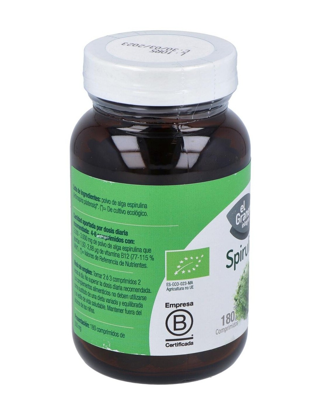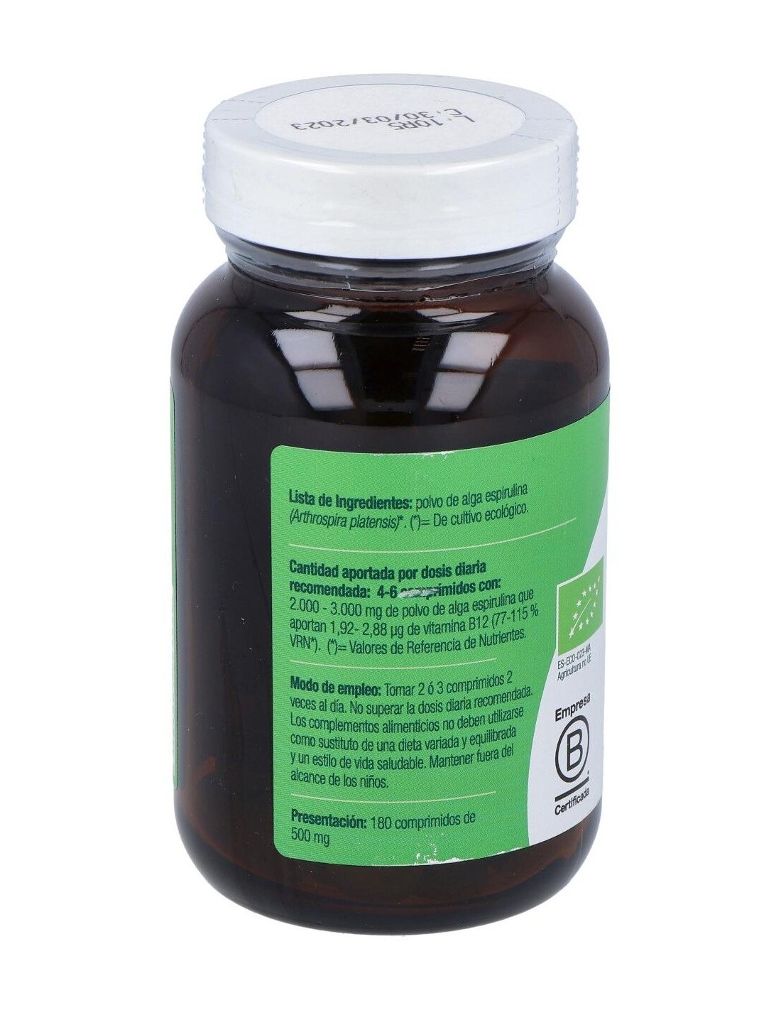 Ingredientes:Polvo de alga espirulina (Spirulina platensis)*. (*) De cultivo ecológico.Modo de empleo:Tomar 2 ó 3 comprimidos 2 veces al día.Presentación:Envase de 180 comprimidos.Recomendaciones y advertencias:Apto para veganos.
