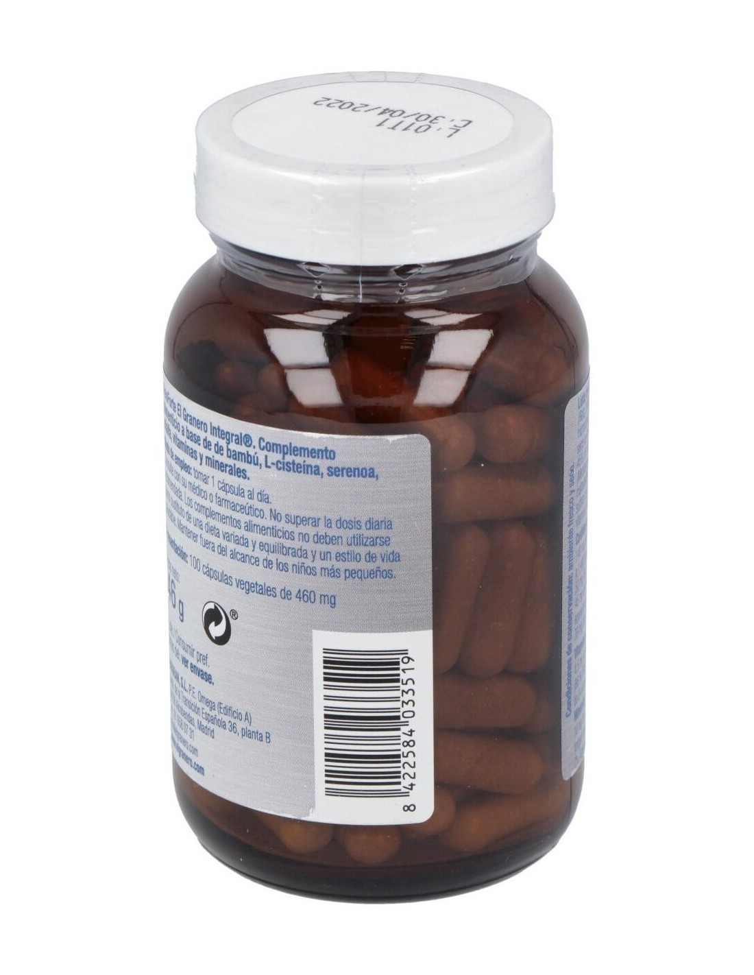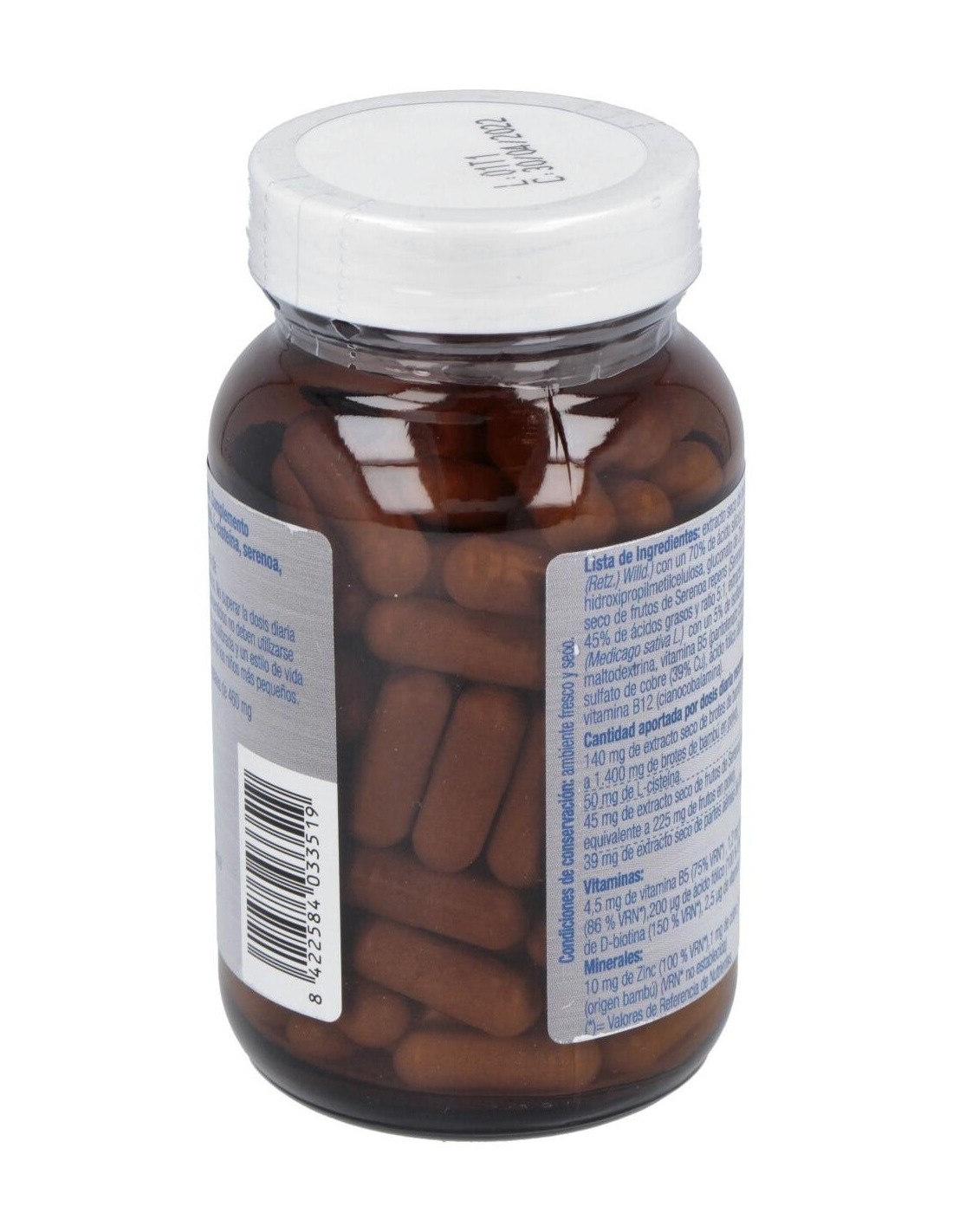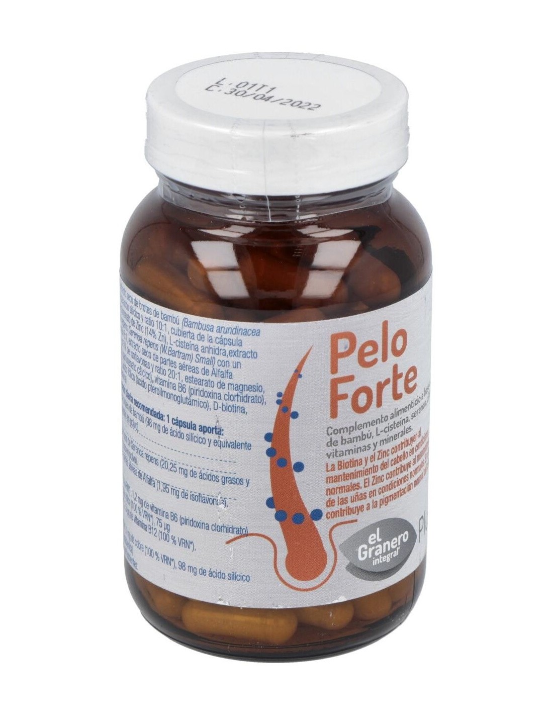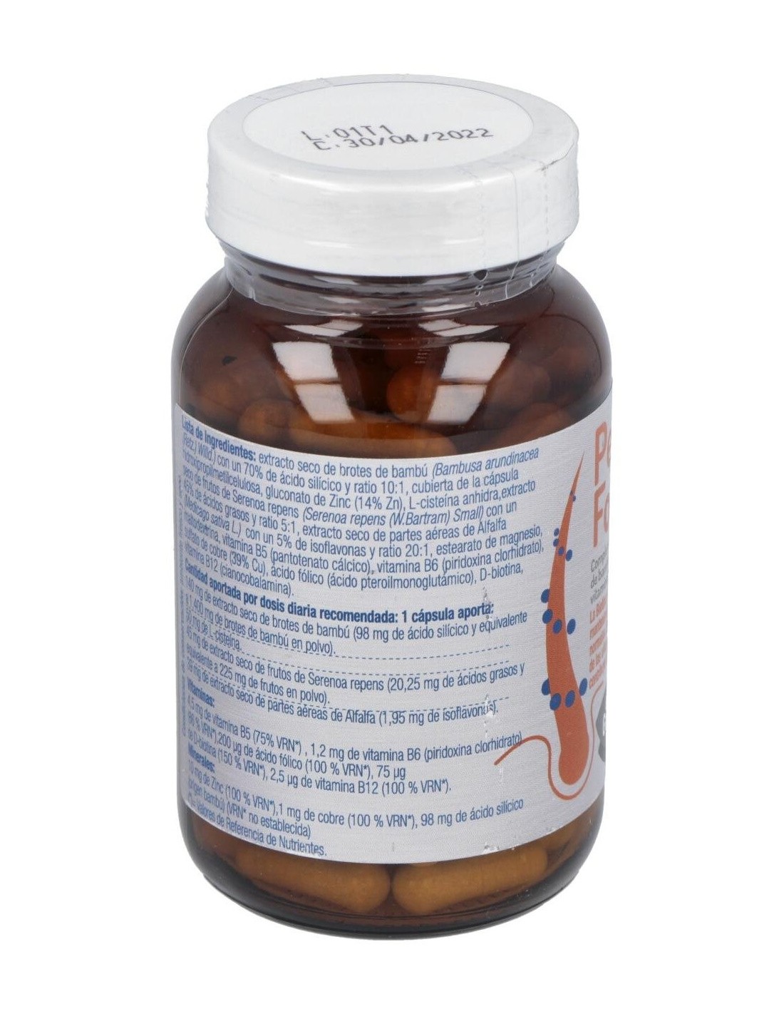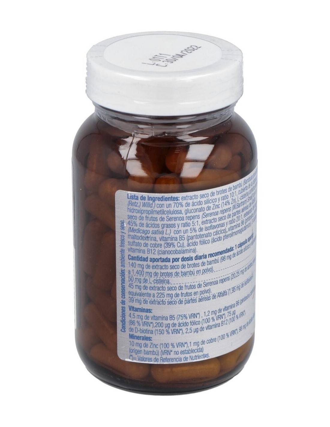 150 mg de extracto seco de brotes de bambú (105 mg de ácido silícico y equivalente a 1500 mg de brote de bambú en polvo), 50 mg de extracto seco de frutos de serenoa repens (22,5 mg de ácidos grasos y equivalente a 250 mg de frutos en polvo), 50 mg de extracto seco de partes aéreas de alfalfa (2,5 mg de isoflavonas), 50 mg de l-cisteína, 4,5 mg de vitamina B5, 1,2 mg de vitamina B6 (piridoxina clorhidrato), 200 mcg de ácido fólico, 75 mcg de d-biotina, 2,5 mcg de vitamina B12, 105 mg de ácido silícico (origen bambú), 10 mg de zinc, 1 mg de cobre.