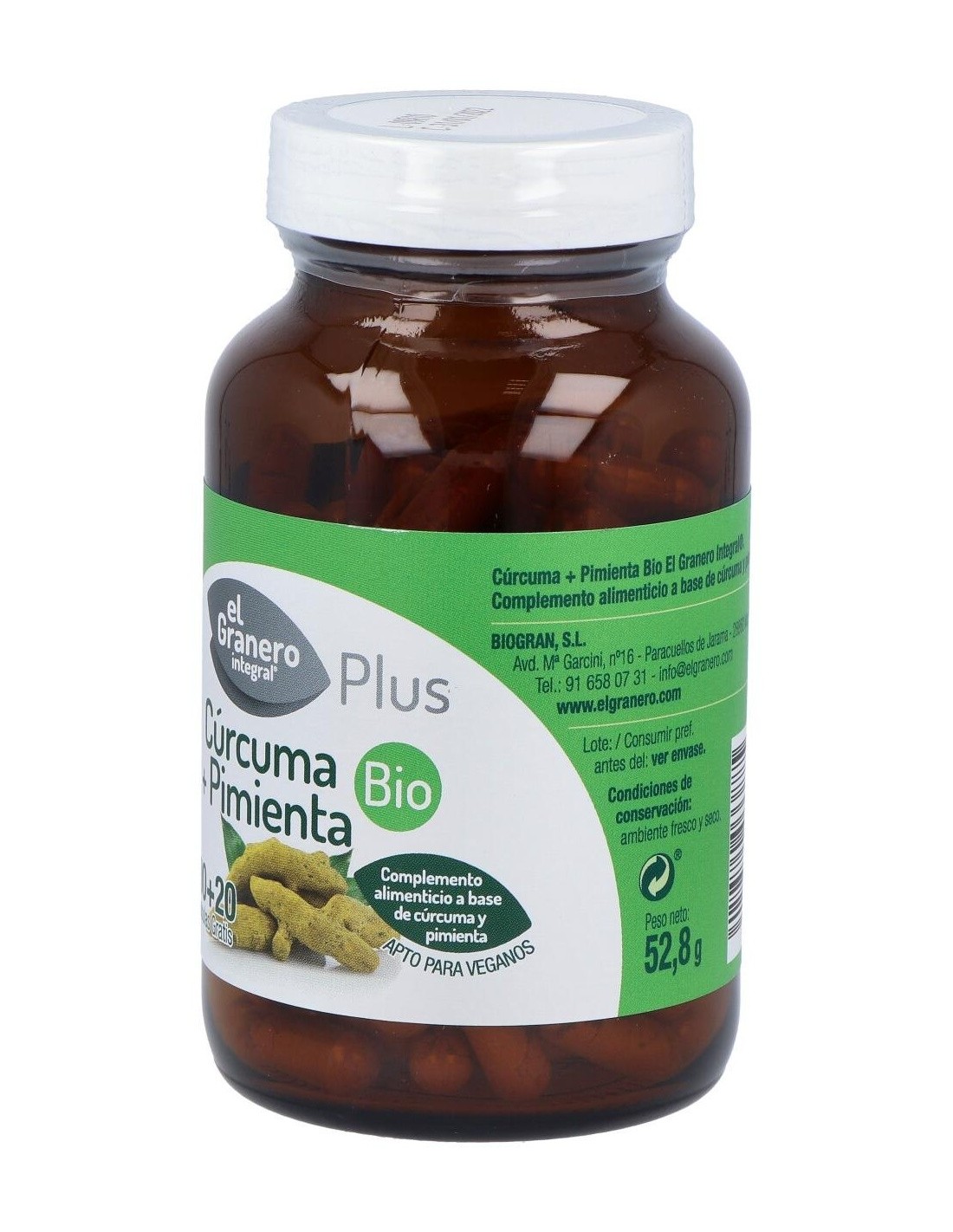 Complemento alimenticio a base de cúrcuma y pimienta. Apto para veganos.