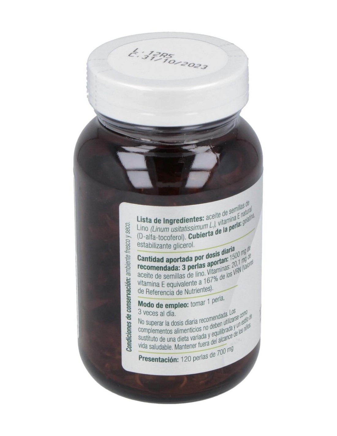 Aceite de semillas de Lino (Linum usitatissimum L.), vitamina E natural (D-alfa tocoferol). Cubierta de la perla: gelatina, estabilizante glicerol.