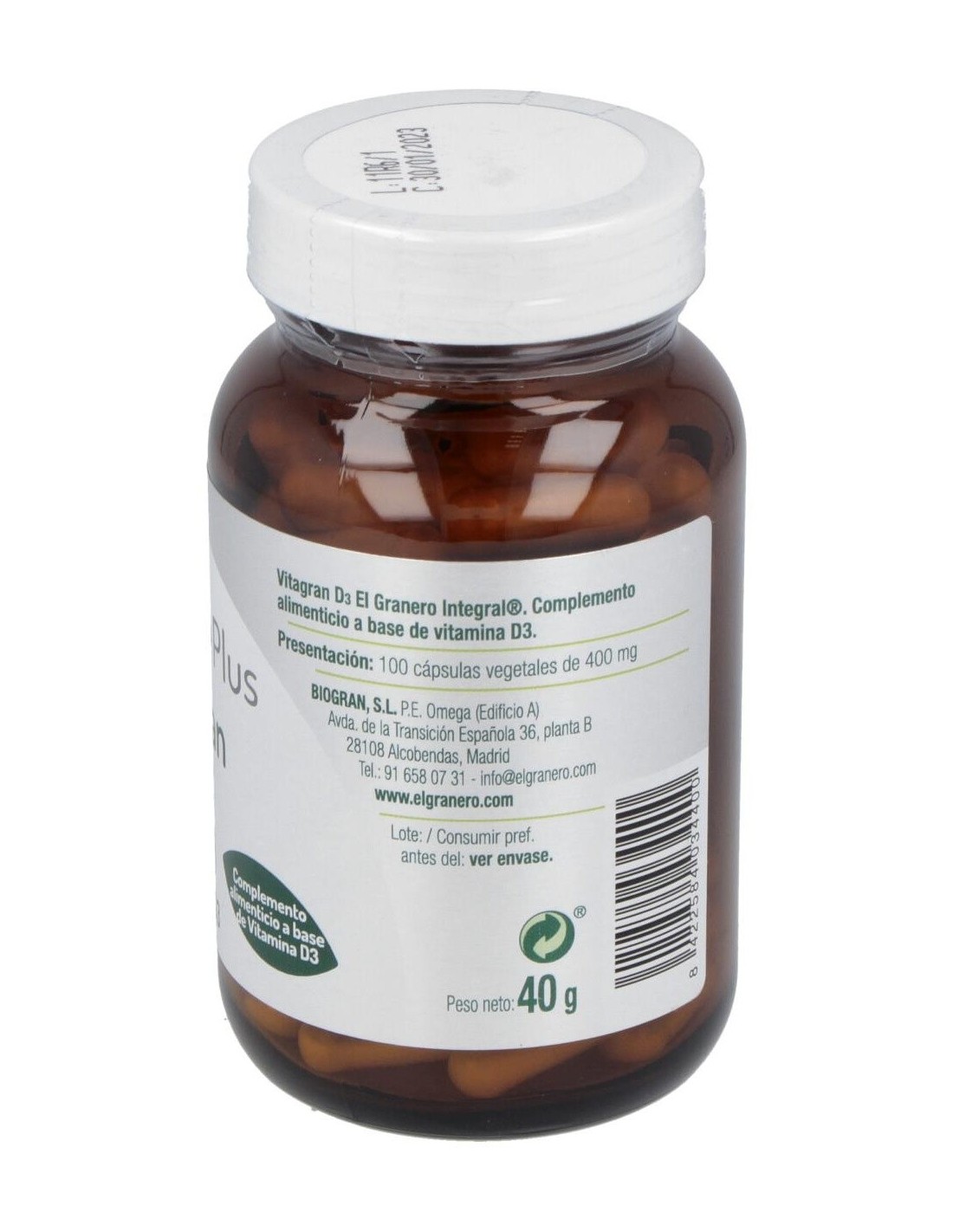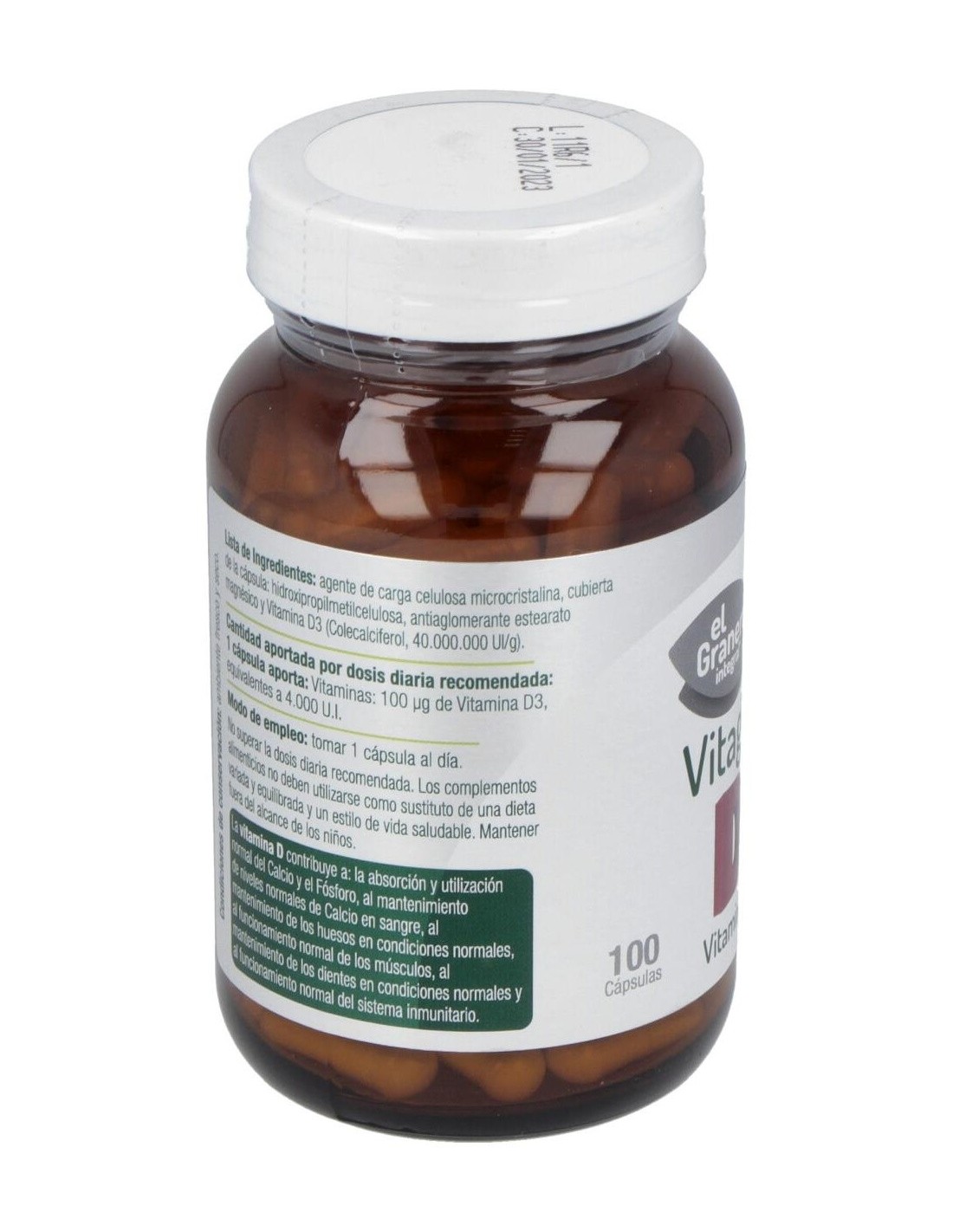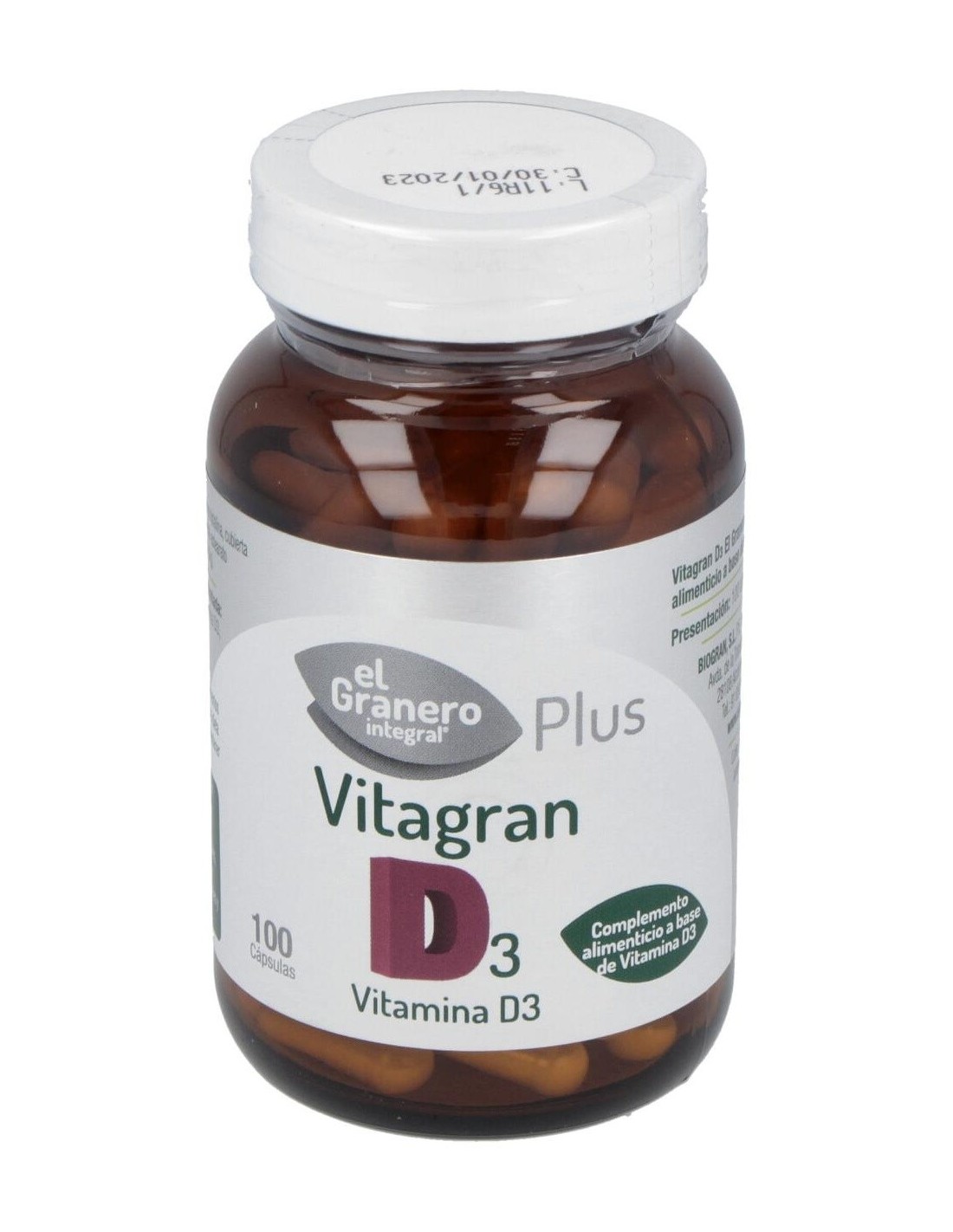 Vitagran D3 100Cap. de El Granero es un suplemento de vitamina D3 para personas que buscan apoyar su salud ósea y sistema inmunológico, formulado con una dosis precisa para facilitar su absorción diaria.