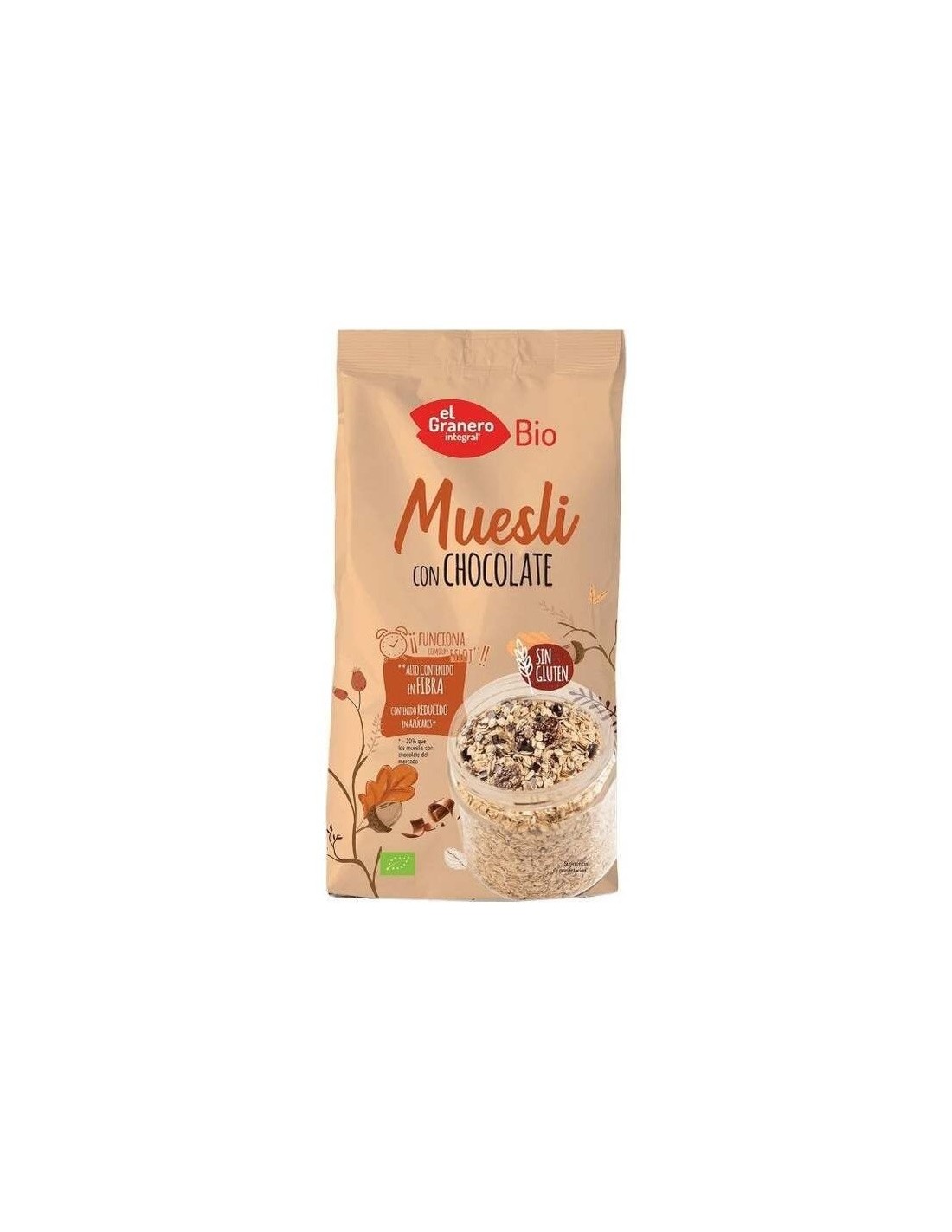 Delicioso muesli de chocolate y avena, sin gluten. Todos sus ingredientes proviene de agricultura ecológica, además contiene un alto contenido en fibra que favorece a mejorar el tránsito intestinal y es bajo en azúcares.