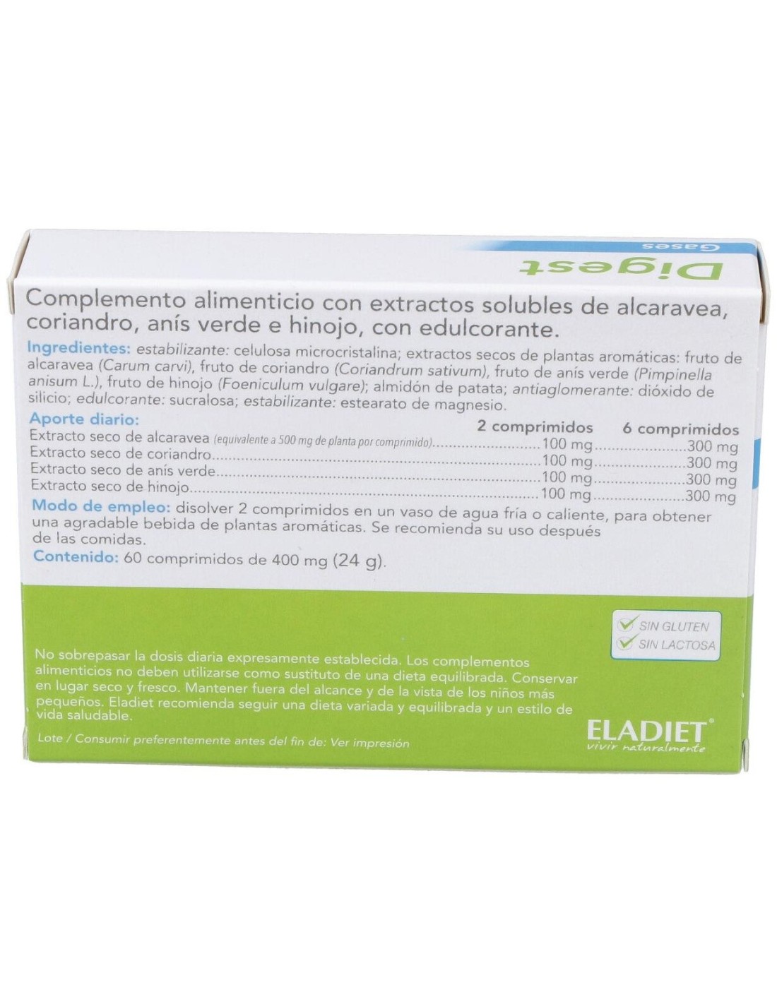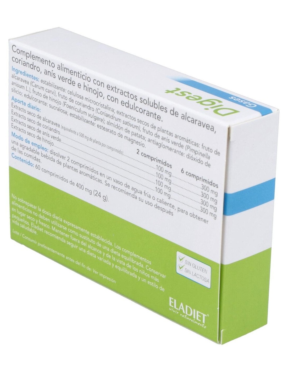 Algunas personas sufren con los gases intestinales puesto que producen molestías como hinchazón o pesadez, dolor abdominal o ruidos en la barrega. El origen de estas molestías puede producirse por malos hábitos alimenticios, comer demasiado rápido o cenar tarde. Digest Gases es un complemento alimenticio que facilita la eliminación de gases o ventosidad evitando la sensación de pesadez abdominal. Su fórmula está compuesta por coriandro, anís verde, hinojo y alcaravea. Especialmente adecuado es la alcaravea puesto que posee propiedades carminativas que reduce las hinchazones y los cólicos. Composición activa por 6 comprimidos: