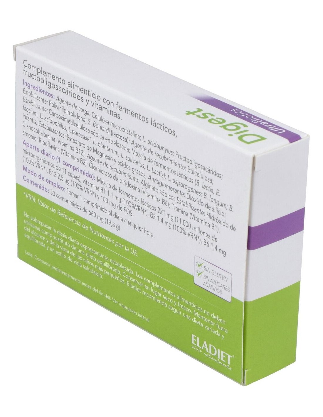 Ingredientes:Agente de carga: Celulosa microcristalina; L. acidophylus; Fructooligosacáridos; Estabilizante: Polivinilpirrolidona; S. Boulardi (lactosa); Agente de recubrimiento: Etilcelulosa; Estabilizante: Carboximetilcelulosa sódica entrelazada; Mezcla de fermentos lácticos (B. lactis, E. faecium, L. acidophilus, L.paracasei, L. plantarum, L. salivarius, L. Lactis); L. esporogenes; B. longum; B. infantis; Estabilizantes: Estearato de Magnesio y ácidos grasos; Antiaglomerante: Dióxido de silicio; Cianocobalamina (Vitamina B12); Agente de recubrimiento: Alginato sódico; Estabilizante: Hidróxido de amonio; Riboflavina (Vitamina B2); Clorhidrato de piridoxina (Vitamina B6); Tiamina (Vitamina B1). Modo de empleo:Tomar 1 comprimido al día o cualquier hora. Presentación:Envase de 30 comprimidos.Recomendaciones y advertencias:No contiene gluten ni azúcares añadidos.