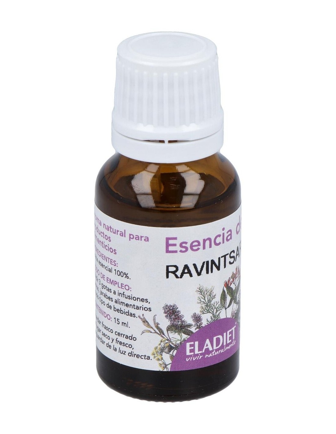 Eladiet Esencia Ravintsara 15ml aceite esencial de ravintsara, cinnamomum camphora. extracto puro, íntegro y natural, obtenido de las hojas y ramas de la planta originaria de madagascar.