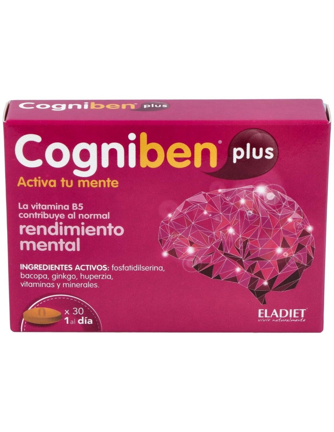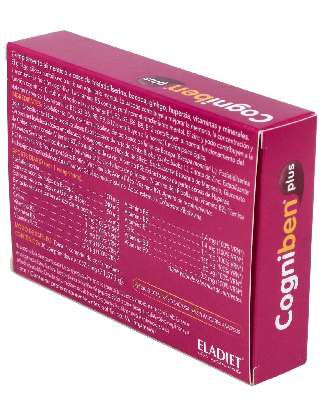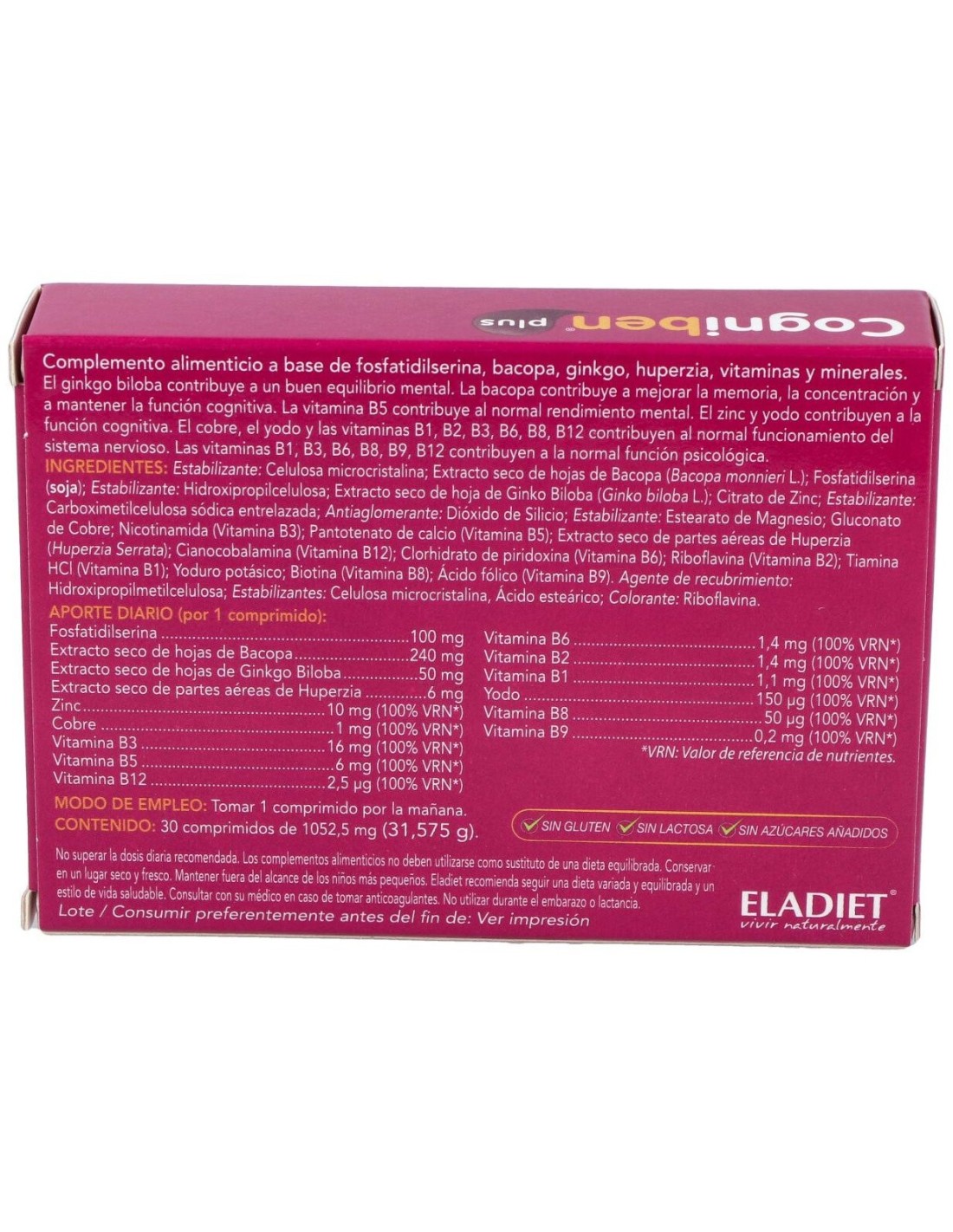 Ingredientes: Estabilizante: Celulosa microcristalina; Extracto seco de hojas de Bacopa (Bacopa monnieri L.); Fosfatidiserina (soja); Estabilizante: Hidroxipropilcelulosa; Extracto seco de hoja de Ginko Biloba (Ginko biloba L.); Citrato de Zinc; Estabilizante: Carboximetilcelulosa sódica entrelazada; Antiaglomerante: Dióxido de Silicio; Estabilizante: Estearato de Magnesio; Gluconato de Cobre; Nicotinamida (Vitamina B3); Pantotenato de calcio (Vitamina B5); Extracto seco de partes aéreas de Huperzia (Huperzia Serrata); Cianocobalamina (Vitamina B12); Clorhidrato de piridoxina (Vitamina B6); Riboflavina (Vitamina B2); Tiamina HCI (Vitamina B1); Yoduro potásico; Biotina (Vitamina B8); Ácido fólico (Vitamina B9). Agente de recubrimiento: Hidroxipropilmetilcelulosa; Estabilizantes: Celulosa microcristalina, Ácido esteárico; Colorante: Riboflavina.Modo de empleo:Tomar 1 comprimido al día por la mañana. Presentación:Envase de 30 comprimidos.Recomendaciones y advertencias:No contiene gluten, lactosa ni azúcares añadidos.