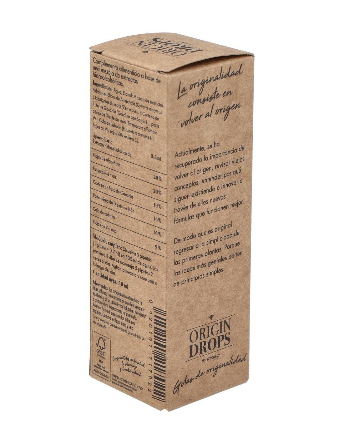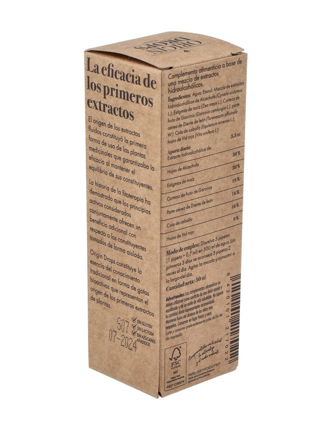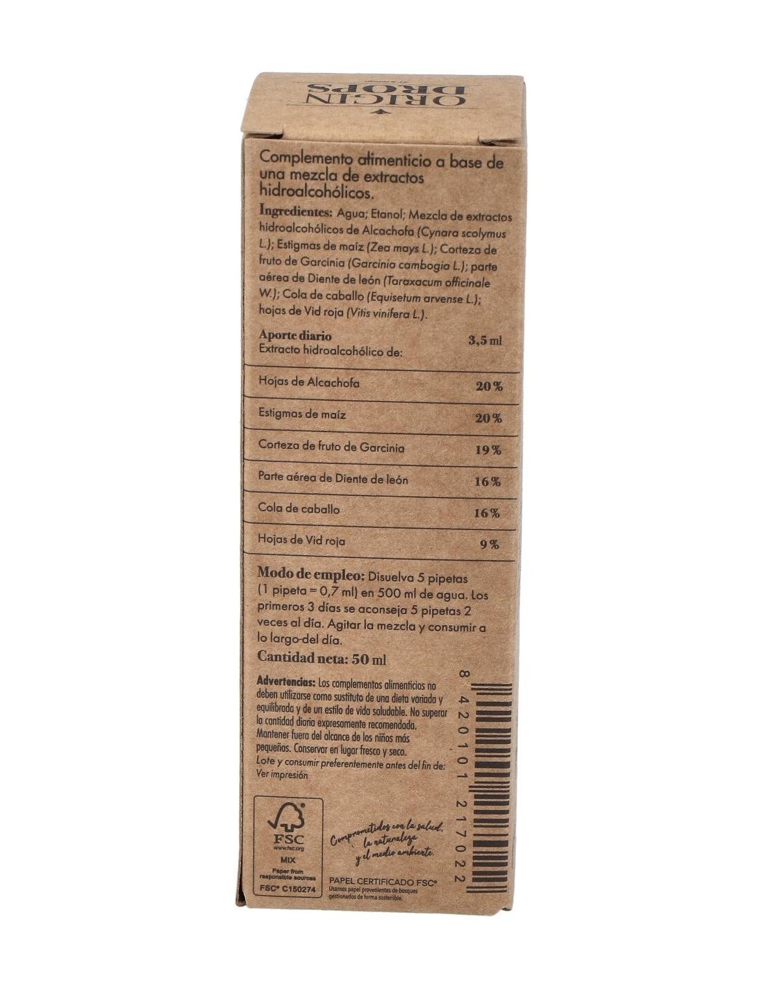 Agua: Etanol: Mezcla de extractos hidroalcohólicos de Alcachofa (Cynara scolymus L.): Estigmas de maíz (Zea mays L.): Corteza de fruto de Garcinia (Garcinia cambogia L.): parte aérea de Diente de león (Taraxacum officinale W.): Cola de caballo (Equisetum arvense L.): hojas de Vid roja (Vitis vinifera L.).