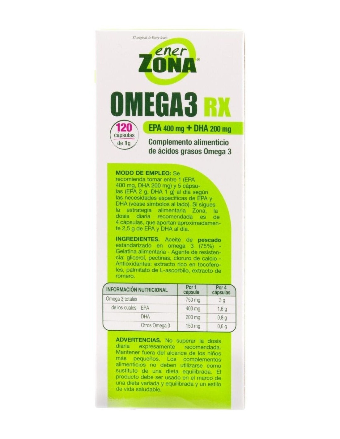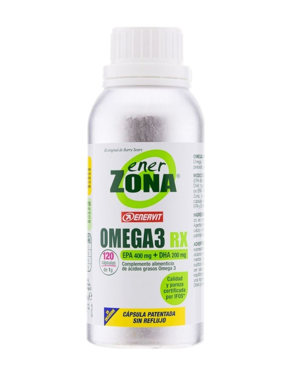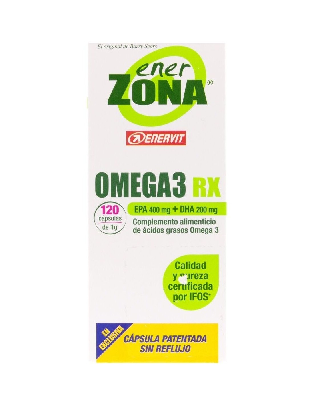 Suplemento dietético de ácidos grasos omega 3. Contiene EPA y DHA en una proporción de 2:1. Certificado por 3 organismos internacionales ( IFOS, ORIVO y Friend of the Sea). Una cápsula patentada sin sabor residual. EnerZona Omega 3 RX , ayuda a cubrir la necesidad de estos ácidos grasos en caso de ingesta reducida o mayor necesidad. EPA y DHA contribuyen a mantener el funcionamiento normal del corazón, cerebro y visión y a mantener niveles normales de triglicéridos en sangre.