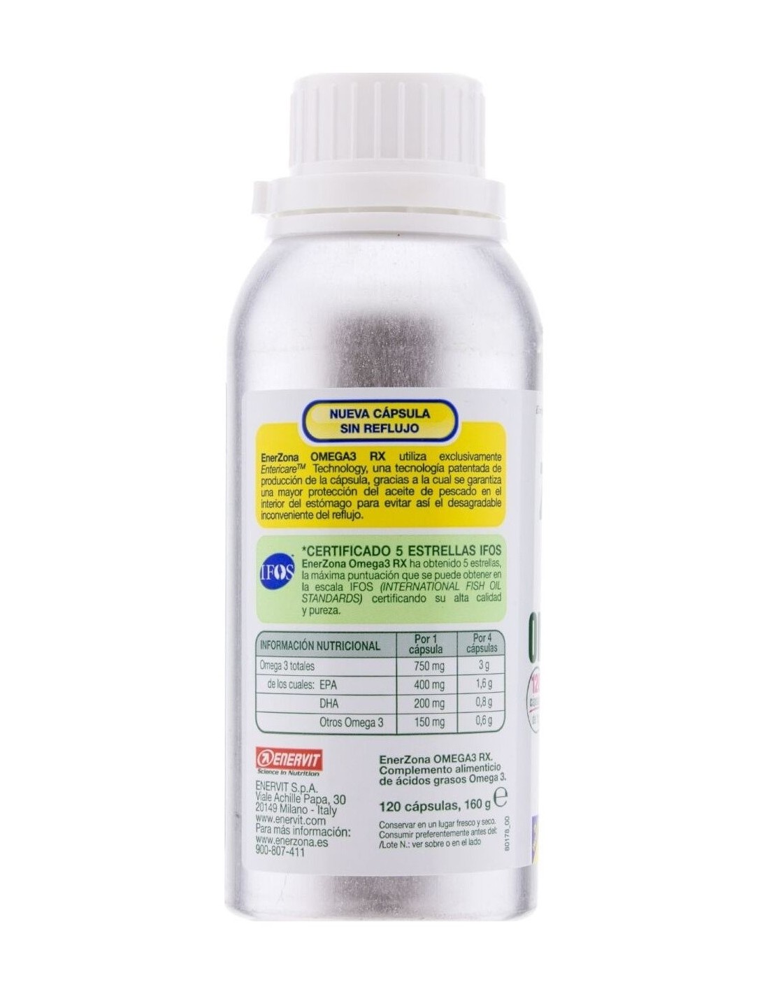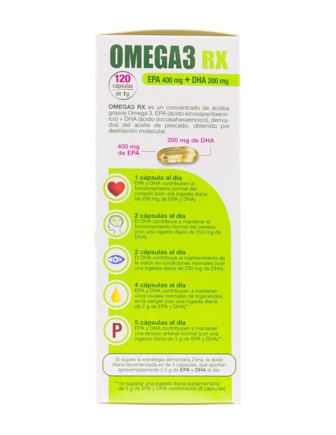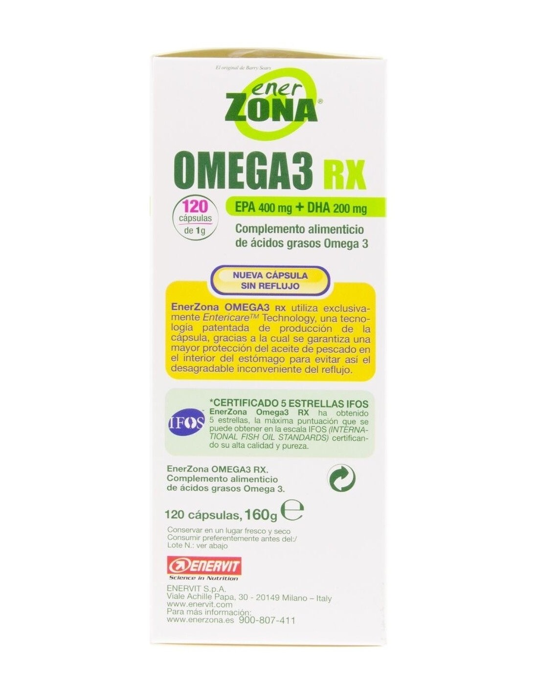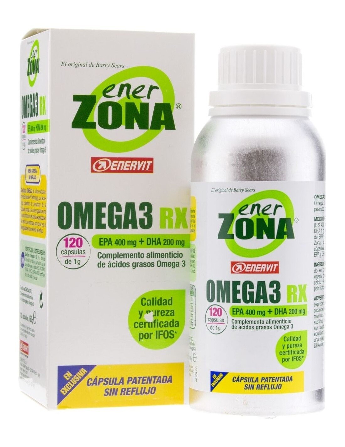 Suplemento dietético de ácidos grasos omega 3. Contiene EPA y DHA en una proporción de 2:1. Certificado por 3 organismos internacionales ( IFOS, ORIVO y Friend of the Sea). Una cápsula patentada sin sabor residual. EnerZona Omega 3 RX , ayuda a cubrir la necesidad de estos ácidos grasos en caso de ingesta reducida o mayor necesidad. EPA y DHA contribuyen a mantener el funcionamiento normal del corazón, cerebro y visión y a mantener niveles normales de triglicéridos en sangre.