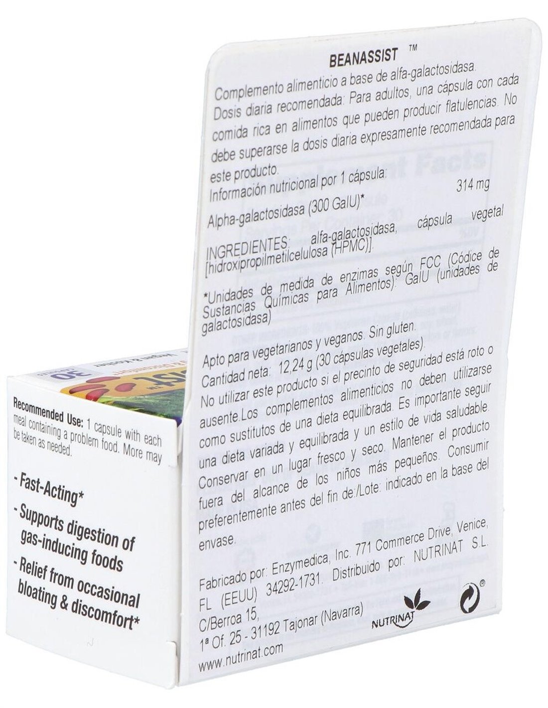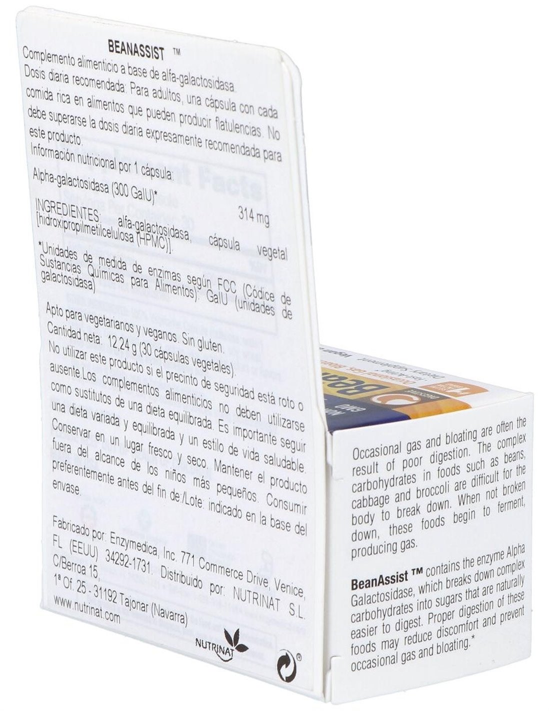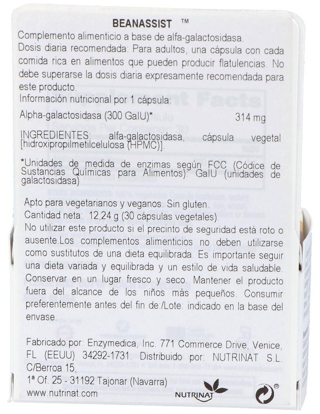 Complemento alimenticio a base de alfa-galactosidasa. Apto para vegetarianos, veganos y Kosher.