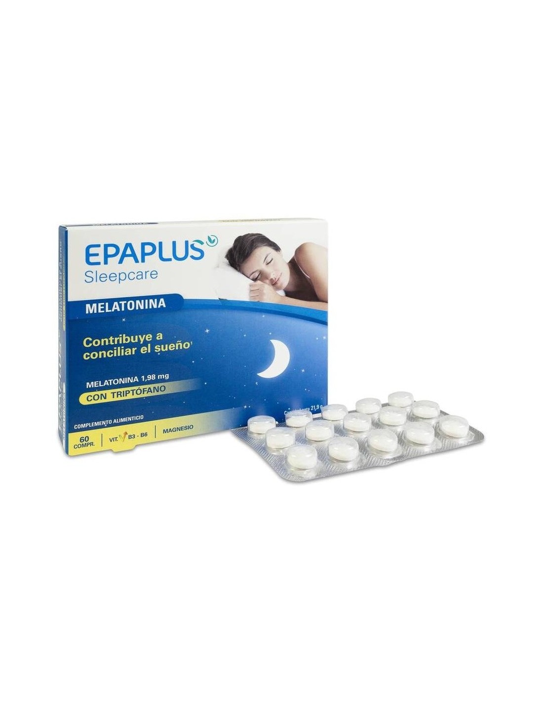 Epaplus Sleepcare Melatonina+Triptofano 60Comp. de Epa Plus es un suplemento para personas que buscan apoyar su descanso nocturno, combinando melatonina y triptófano para favorecer un sueño natural y equilibrado.