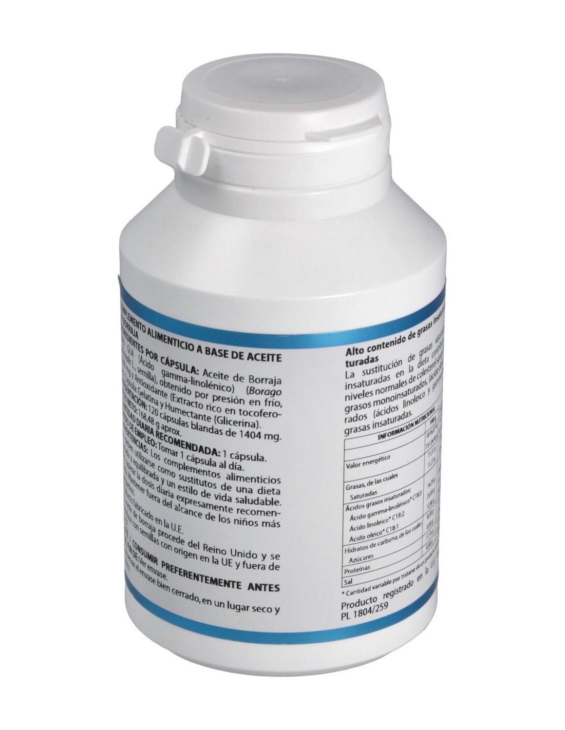 El ácido gammalinolénico o GLA es escaso en el reino vegetal pero bastante abundante en las semillas de la borraja. El organismo no lo puede sintetizar y debe tomarlo de los alimentos. Es importante porque es un precursor de las prostaglandinas serie 1. Las prostaglandinas se forman en las membranas celulares de ciertos tejidos y en la pared interna de los vasos. Entre otras acciones conservan el equilibrio (homeostasis) de las constantes sanguíneas. Tienen acción antiagregante plaquetaria y vasodilatadora. Sus efectos positivos son contrarrestados por las prostaglandinas serie 2, que tienen efectos contrarios, con el fin de mantener el equilibrio. No obstante, a veces puede producirse una menor cantidad de las prostaglandinas serie 1 al inhibirse la enzima delta-6-desaturasa, por causas diversas como el estrés físico y emocional, los medicamentos, el envejecimiento, diabetes, cáncer o disfunciones hepáticas, entre otras causas, y acarrear una mayor acción negativa de las prostaglandinas serie 2. Ingredientes:1.000 mg de aceite de borraja obtenido por presión en frío. Cápsula: Agente de recubrimiento (Gelatina), Humectantes (Glicerina y Sorbitol) y Aroma (Vainilla). Modo de empleo:Tomar 1 perla al día. Presentación:Bote de 120 perlas.
