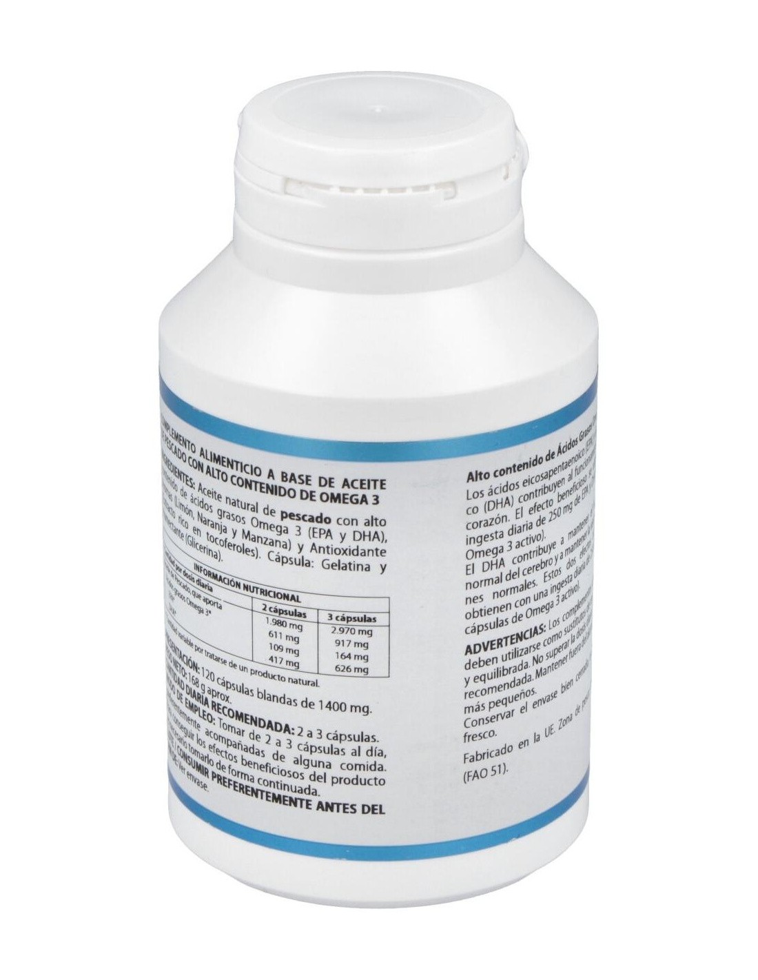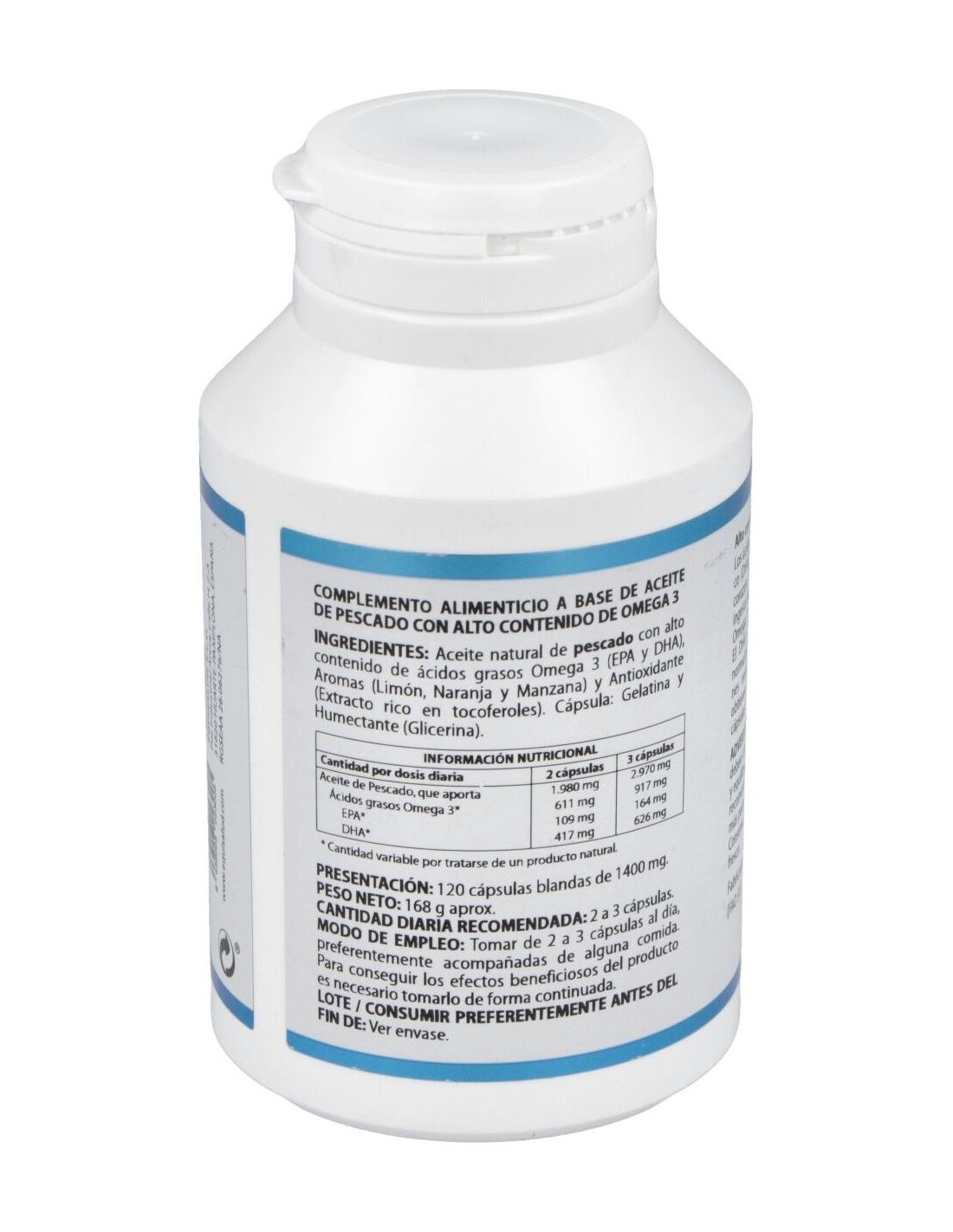 990 mg de aceite de pescado natural (54,54 mg EPA, 208,58 mg DHA y 42,49 mg otros omega 3).