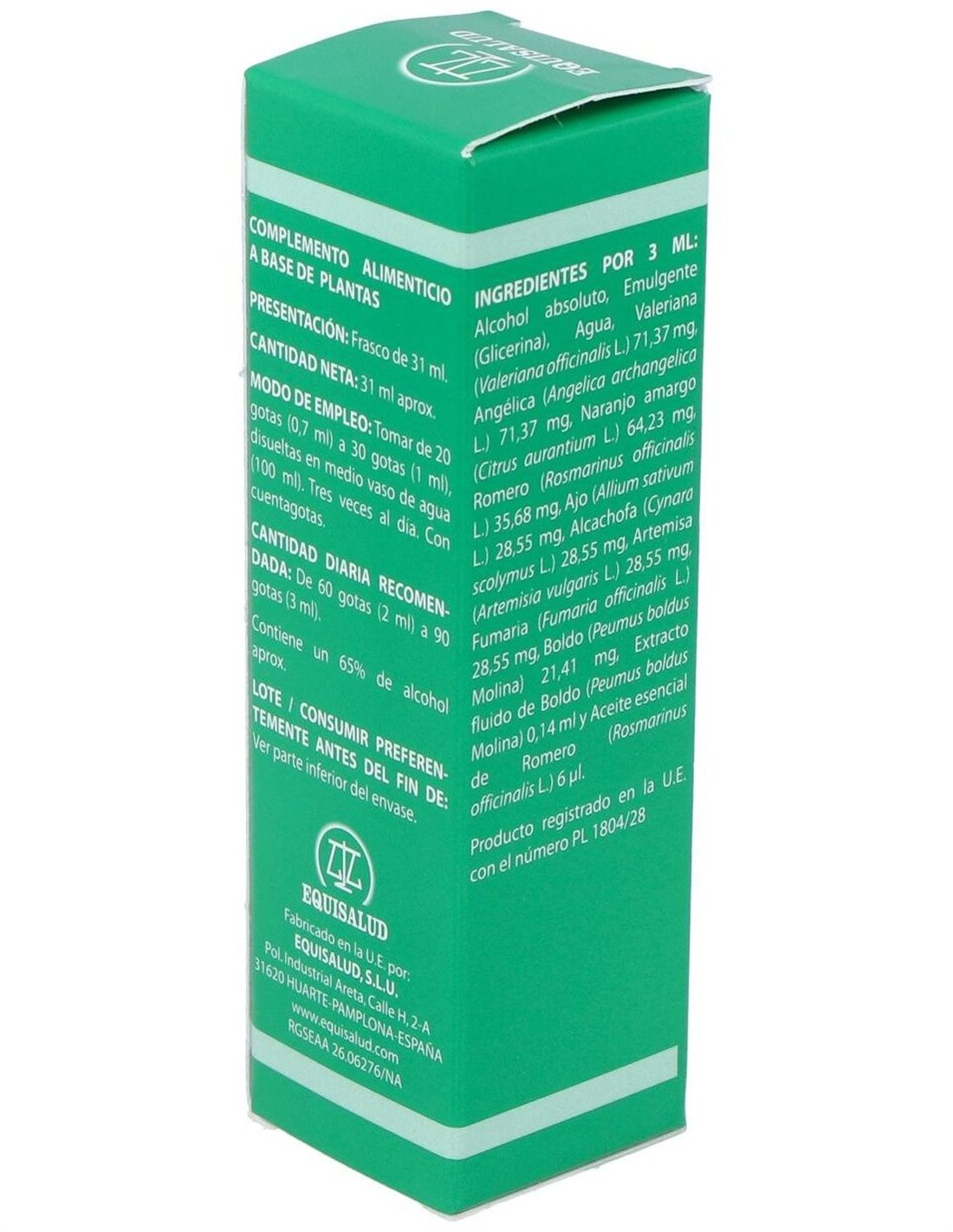 En la patología occidental este síndrome se identifica con ciertas neurosis, cistitis crónica, dismenorrea y alteraciones menstruales, ciertas faringitis, dispepsias biliares, otros trastornos digestivos, ansiedad y algunas depresiones. Causas psicoafectivas generalmente. Manifestaciones asociadas a este síndrome: Depresión e irritabilidad, suspiros, ansiedad, sueño inquieto, opresión torácica, dolor e hinchazón del pecho en seno y en bajo vientre, dismenorrea (dolor por estancamiento), menstruación irregular; pulso tenso, sensación de cuerpo extraño en garganta, sensación de plenitud o dolor epigástrico, regurgitaciones ácidas, gases, eructos. Masas fijas o móviles en vientre, dolor en los flancos. Se da en personas contrariadas. Composición:Angélica (Angelica archangelica), Boldo (Peumus boldus), Alcachofa (Cynara scolymus), Fumaria (Fumaria officinalis), Romero (Rosmarinus officinalis), Ajo (Allium sativum), Artemisa (Artemisia vulgaris), Azahar (Citrus aurantium), Naranja amarga (Citrus aurantium var amarus), Valeriana (Valeriana officinalis). Modo de empleo:Tomar de 20 a 30 gotas disueltas en medio vaso de agua, 3 veces al día. Presentación:Frasco de 31 ml.