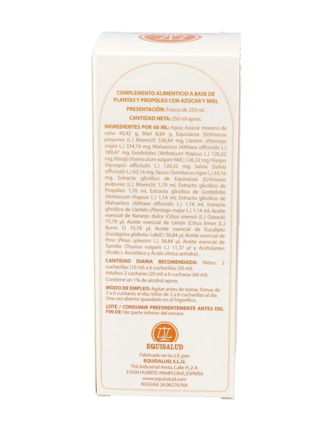 La acción de este jarabe se debe a la sinergia que se produce como consecuencia de la unión del propóleo, con efecto antiséptico y potenciador del sistema inmune, reforzado por la acción de la equinácea, junto con plantas con acción antitusiva y antiséptica. Propiedades de los principios activos: