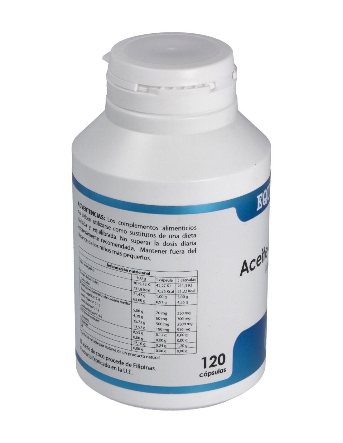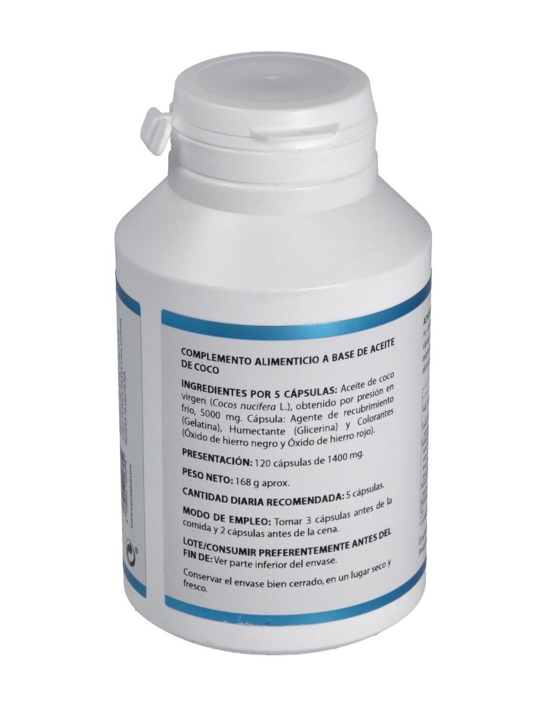 El aceite de coco también tiene otras interesantes propiedades: es un protector cardíaco, estimula ligeramente el tiroides y ayuda a tener controlado el colesterol y los triglicéridos. Composición por perla:1.000 mg de aceite de coco virgen y orgánico. Modo de empleo:Tomar 5 perlas al día, 3 antes de comer y 2 antes de cenar. Presentación:Bote de 120 perlas.