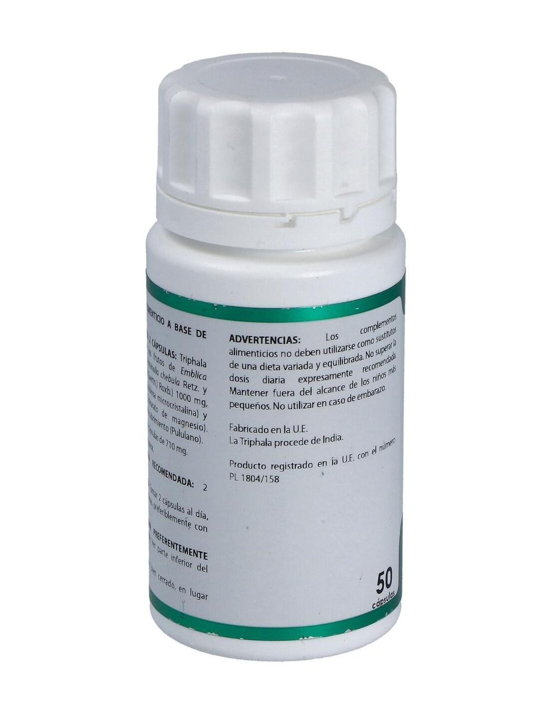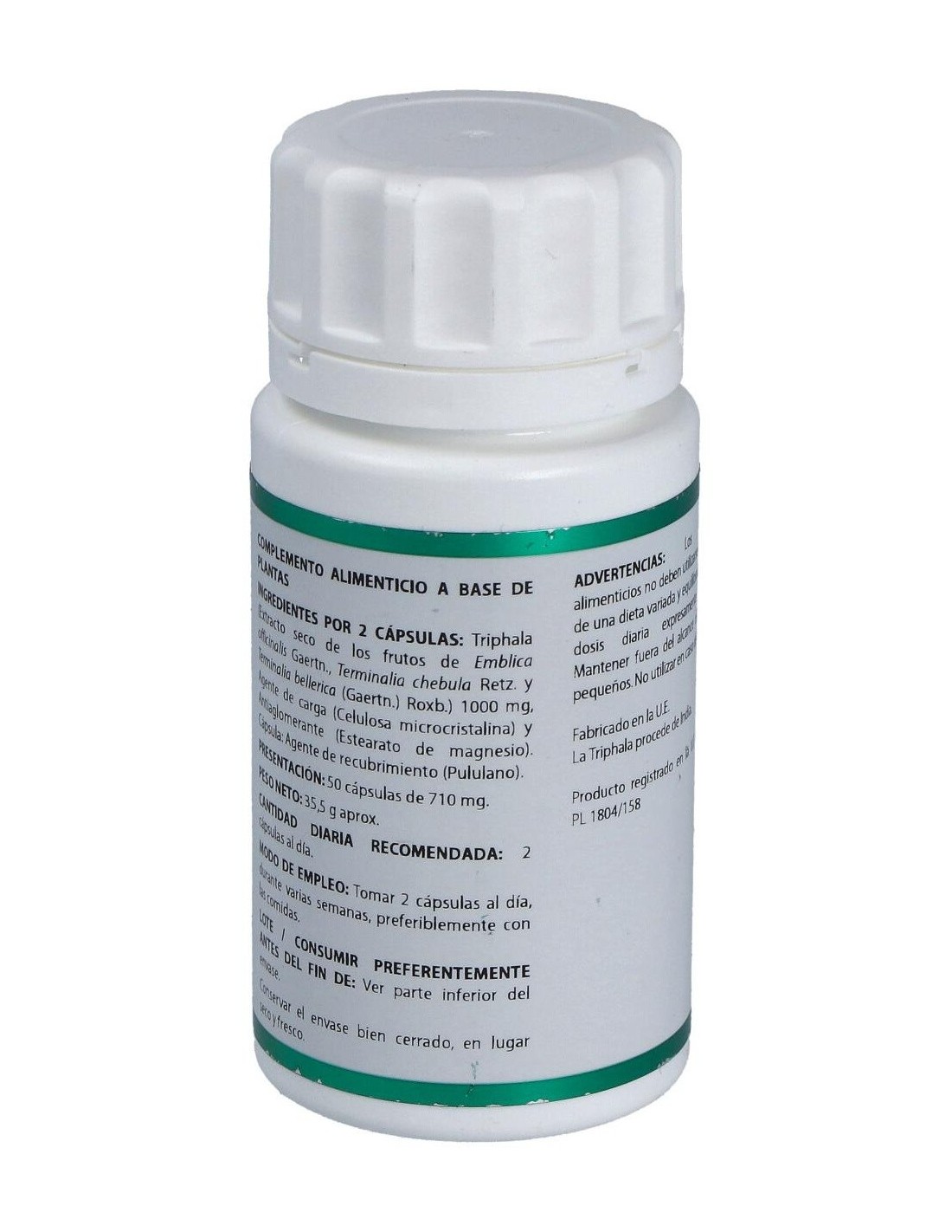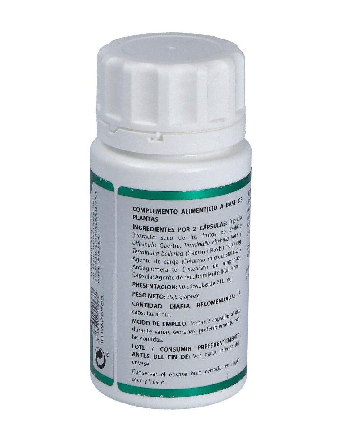 Composición por cápsula:500 mg de extracto seco de triphala.Modo de empleo:Tomar 2 cápsulas al día durante la comida.Presentación:Bote de 50 cápsulas.